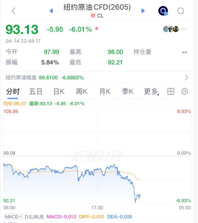 【#国际油价直线下挫# 】#美油布油双双跌破100美元# 4月14日晚间,国际油