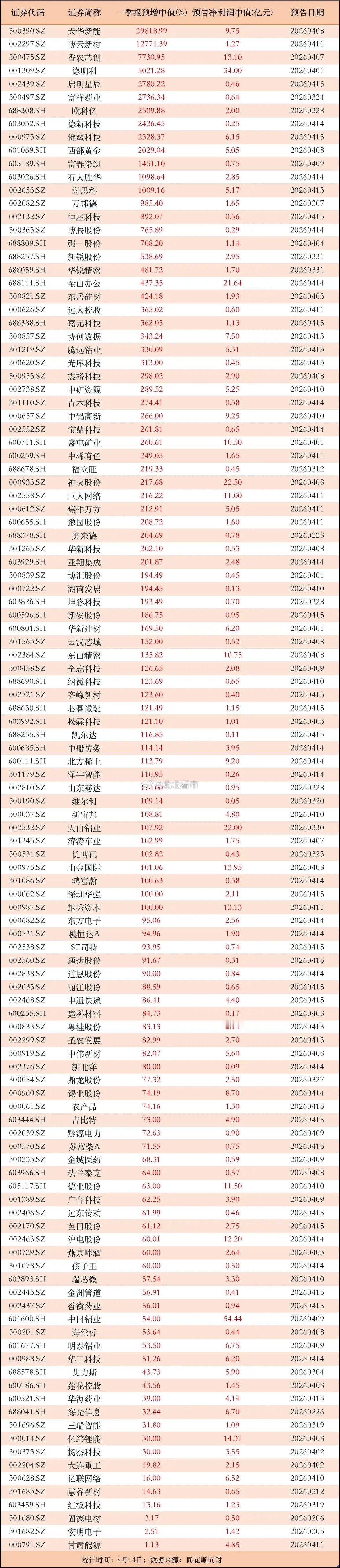 4月14日两市迎来了一波预告小高峰,晚间逾20家公司集体发布一季报预增。截至发稿时,两市一季报业绩预增的公司已经突破100家了,有18家公司一季报大幅预增500%以上。