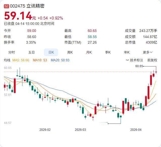 立讯精密2025年报来了:营收3323.44亿,净利166亿,双双刷新历史纪录! 4月14日晚间,公司正式披露2025年年报,营收同比增长23.64%,归母净利润同比增长24.20%。Q4单季净利润50.81亿,环比Q3的48.74亿继续增长,全年呈现逐季走强的态势。公司拟每10股派1.4元,合计派现约10.2亿元。