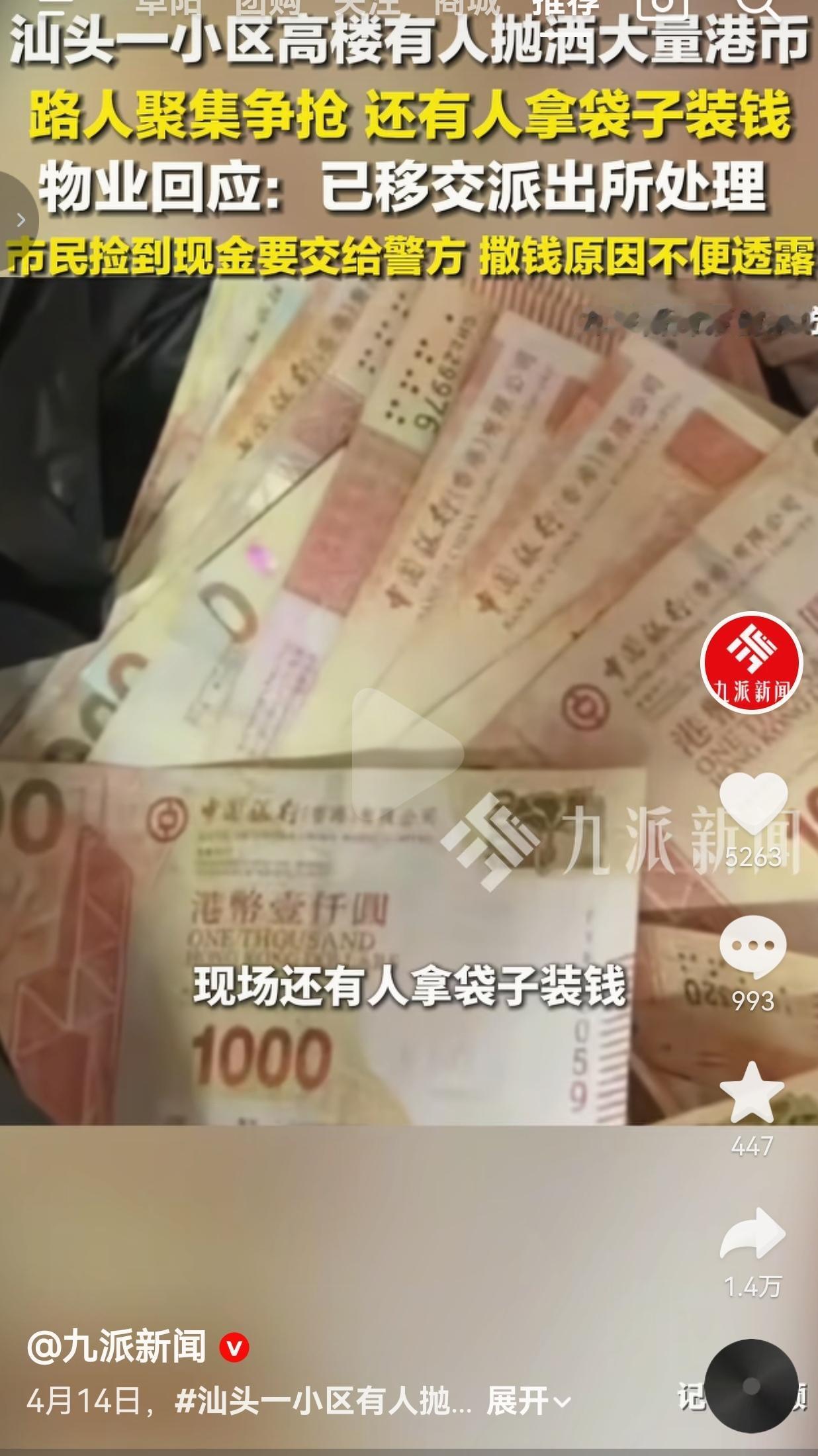 事情发生在4月14日的汕头合信·星湖城小区,监控和路人拍的视频里,能清清楚楚看到,高楼的窗户里不断有港币飘出来,全是1000元面额的大钞,据现场目击者说,抛洒的金额足足有100多万港币!