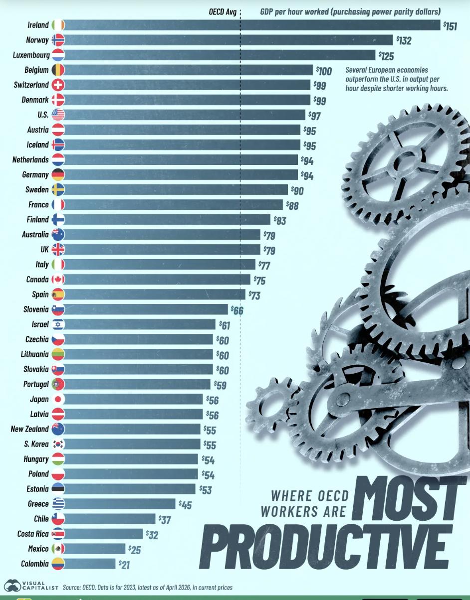 外媒:根据经合组织2023年数据,爱尔兰以每小时151美元(购买力平价计算)的GDP产出高居全球生产力榜首,但该国数据受跨国企业利润转移影响显著,若按国民总收入计算则降至115美元。