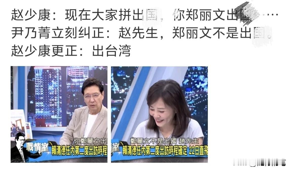 没想到节目期间赵少康一时口快,说错话,把郑丽文出台湾形容错误,尹乃菁见状立刻打断赵少康的发言,纠正赵少康的口误。