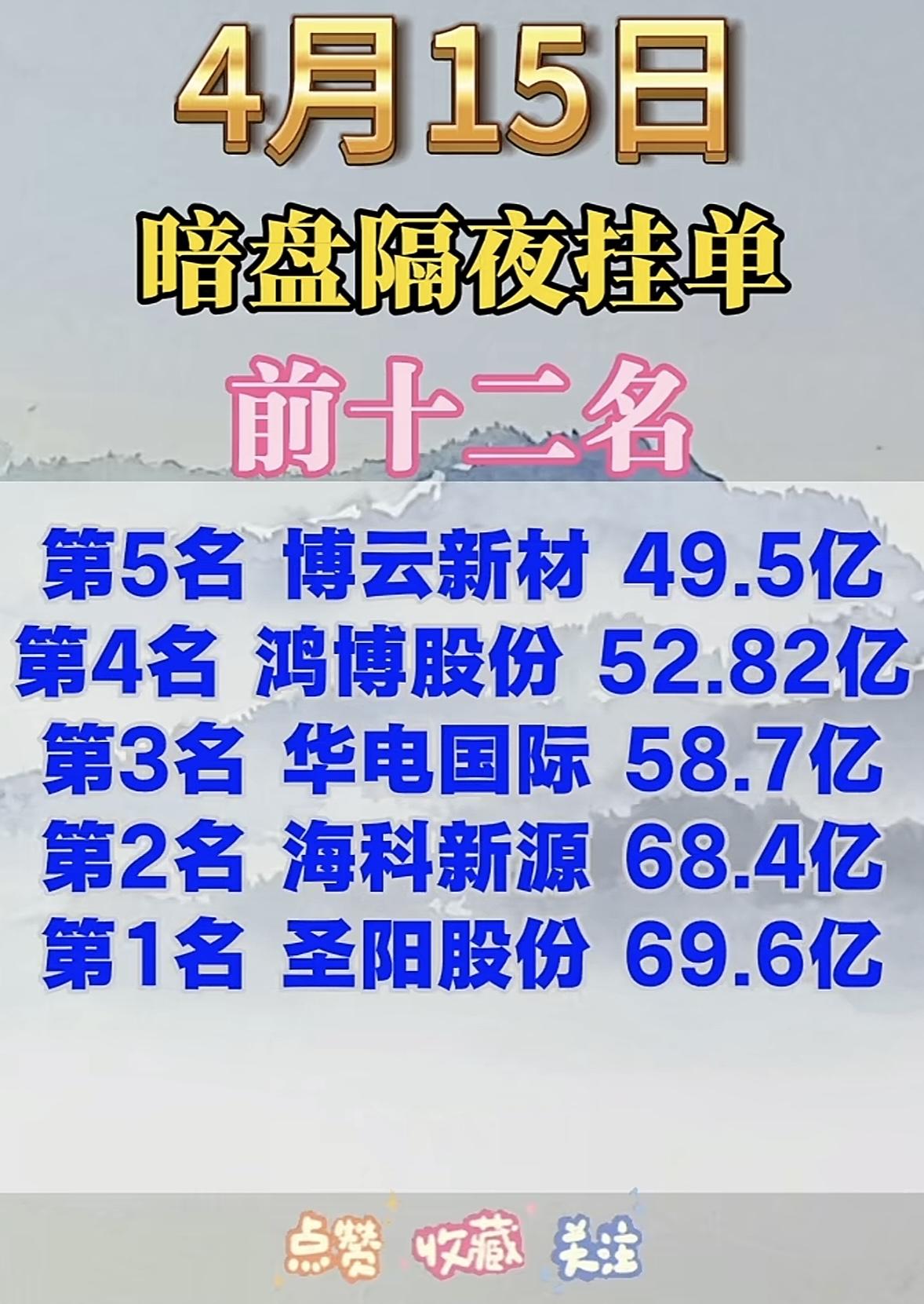 4月15日暗盘隔夜挂单榜前十二名新鲜出炉!来看看都有谁。4月14日的挂单数据里,圣阳股份以现价20.88元、挂单52.08亿位居第一,实力不容小觑。博云新材现价12.08元,挂单48.60亿紧随其后。中国巨石、盛新锂能等也都在榜单前列。