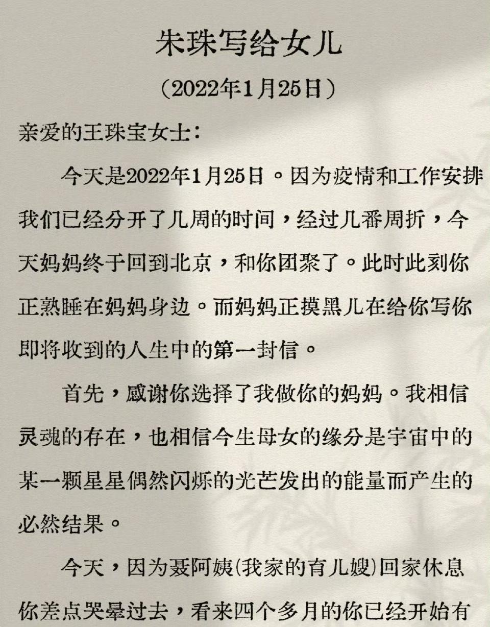 女儿出生四个月时,朱珠以"王珠宝女士"为抬头手写第一封信,拒绝使用"宝贝"等传统