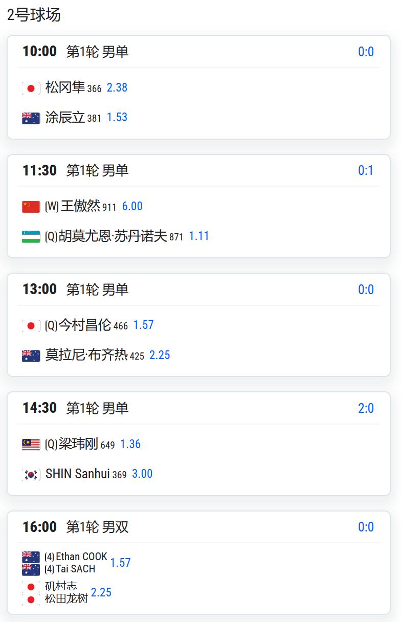 王傲然将对阵从资格赛突围的苏丹诺夫;