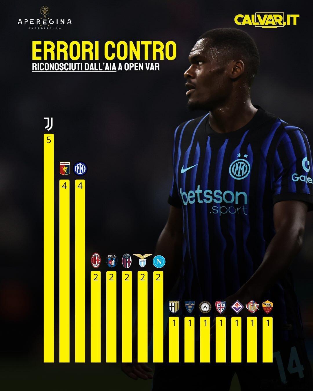 根据裁判协会的官方报告 本赛季目前为止出现了4次对国米不利的误判 而有1次对国米