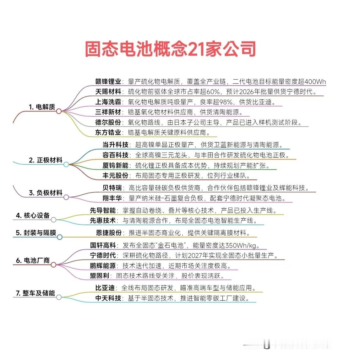 固态电池的核心优势,是用固态电解质替代传统液态电解液,从根本上解决锂电池的安全隐患,同时大幅提升能量密度,让电动车续航突破1000公里成为常态。从产业链看,赛道分为上游材料、中游制造、下游应用三大环节,每个环节都有明确的技术壁垒与成长逻辑:上游电解质、正负极材料是技术核心,决定电池性能;中游设备与封装是量产关键;下游电池厂与车企是需求终端,推动技术迭代。