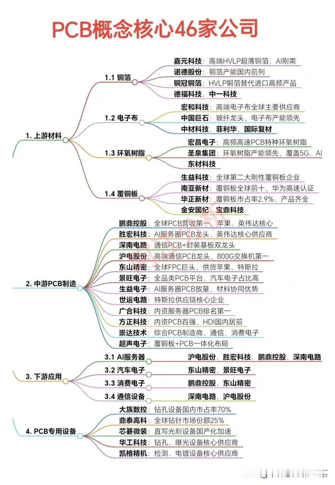 AI服务器主线:胜宏科技是AI服务器PCB绝对龙头,英伟达核心供应商;鹏鼎控股全球PCB营收第一,深度绑定苹果、英伟达;沪电股份是高端通信PCB龙头,800G交换机市占率第一;深南电路是通信PCB+封装基板双龙头。