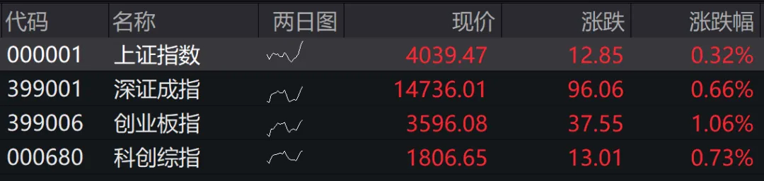 #A股四大指数集体高开#【A股高开,#创业板指创近11年新高#】4月15日,A股四大指数集体高开,上证指数涨0.32%,深证成指涨0.66%,创业板指涨1.06%创10年多新高,科创综指涨0.73%。盘面上,存储器、超硬材料、算力硬件、能源金属、黄金、创新药、AI应用、半导体概念股走强,油气股回调。市场逾3700股上涨。
