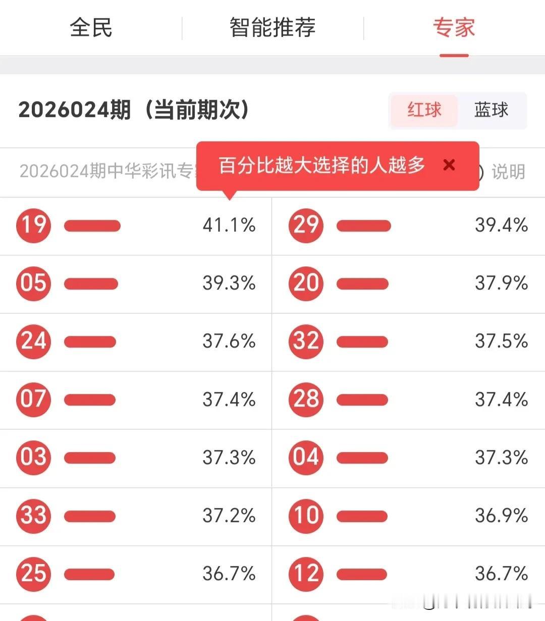 红球方面,专家端聚焦19、05、24,选择率均超37%;智能推荐端偏好极度集中,29(96%)、13(90.7%)、03(94.7%)断层领先;全民端选号更均衡,无极端热门。三方共同关注02、03、04、07、12,可作为热度交集参考。