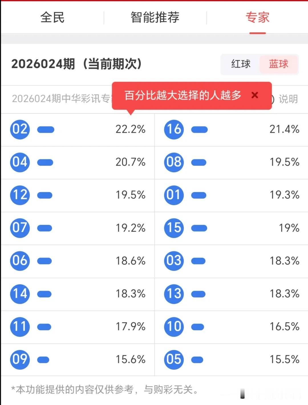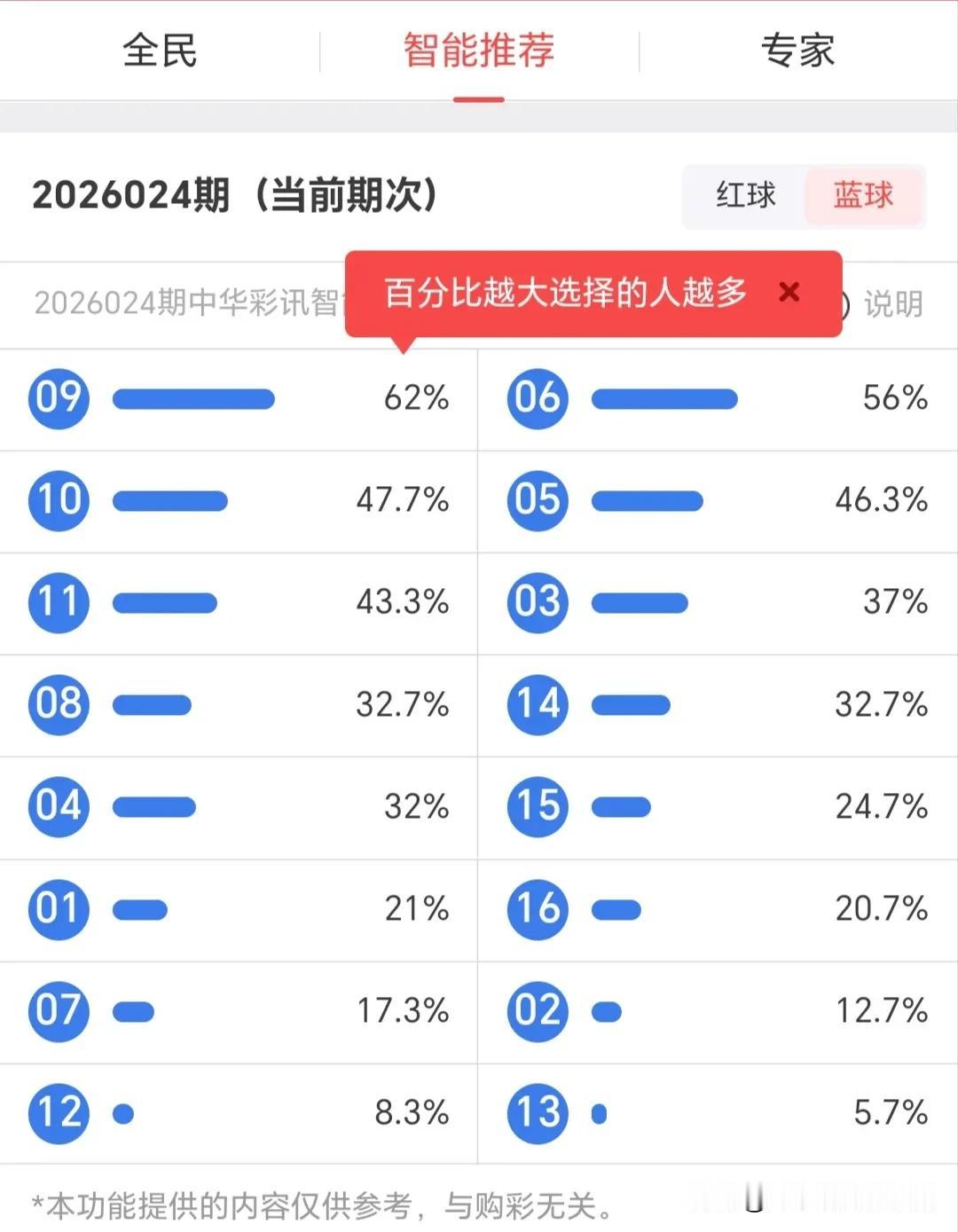 蓝球方面,专家端看好16、08、01,智能推荐端侧重06、05、03,全民端分布更平均,03、05、06为三方交集号码。