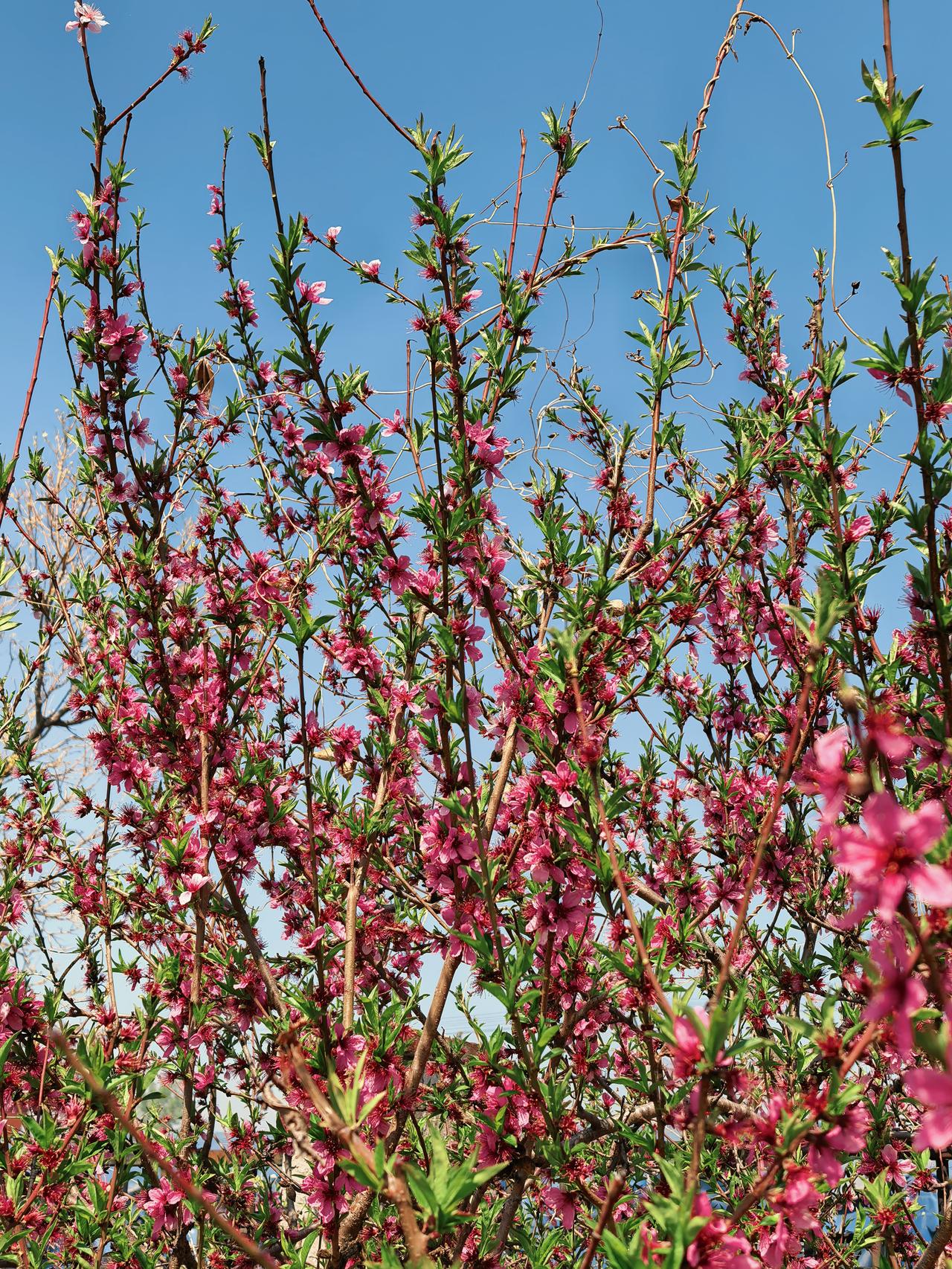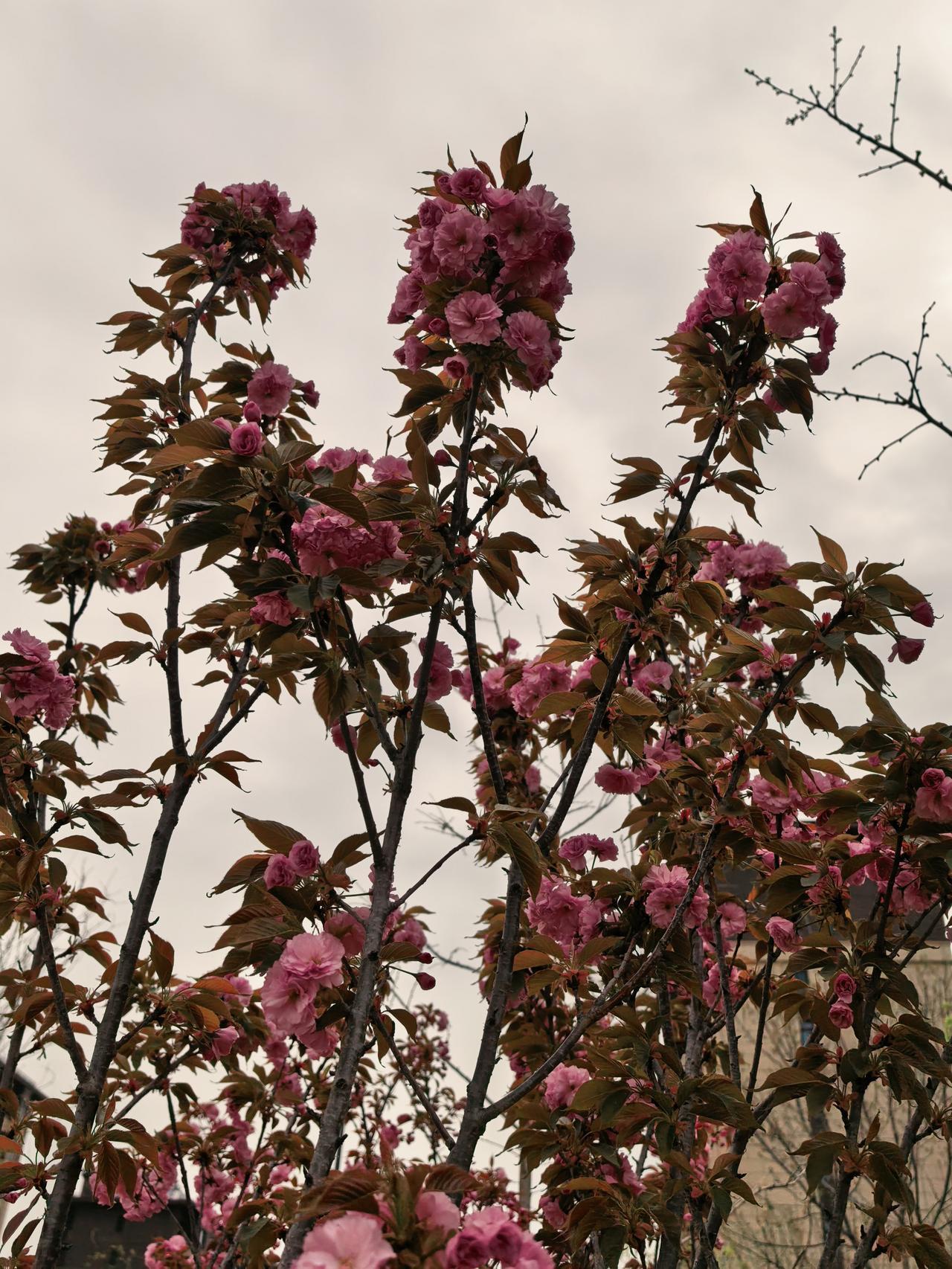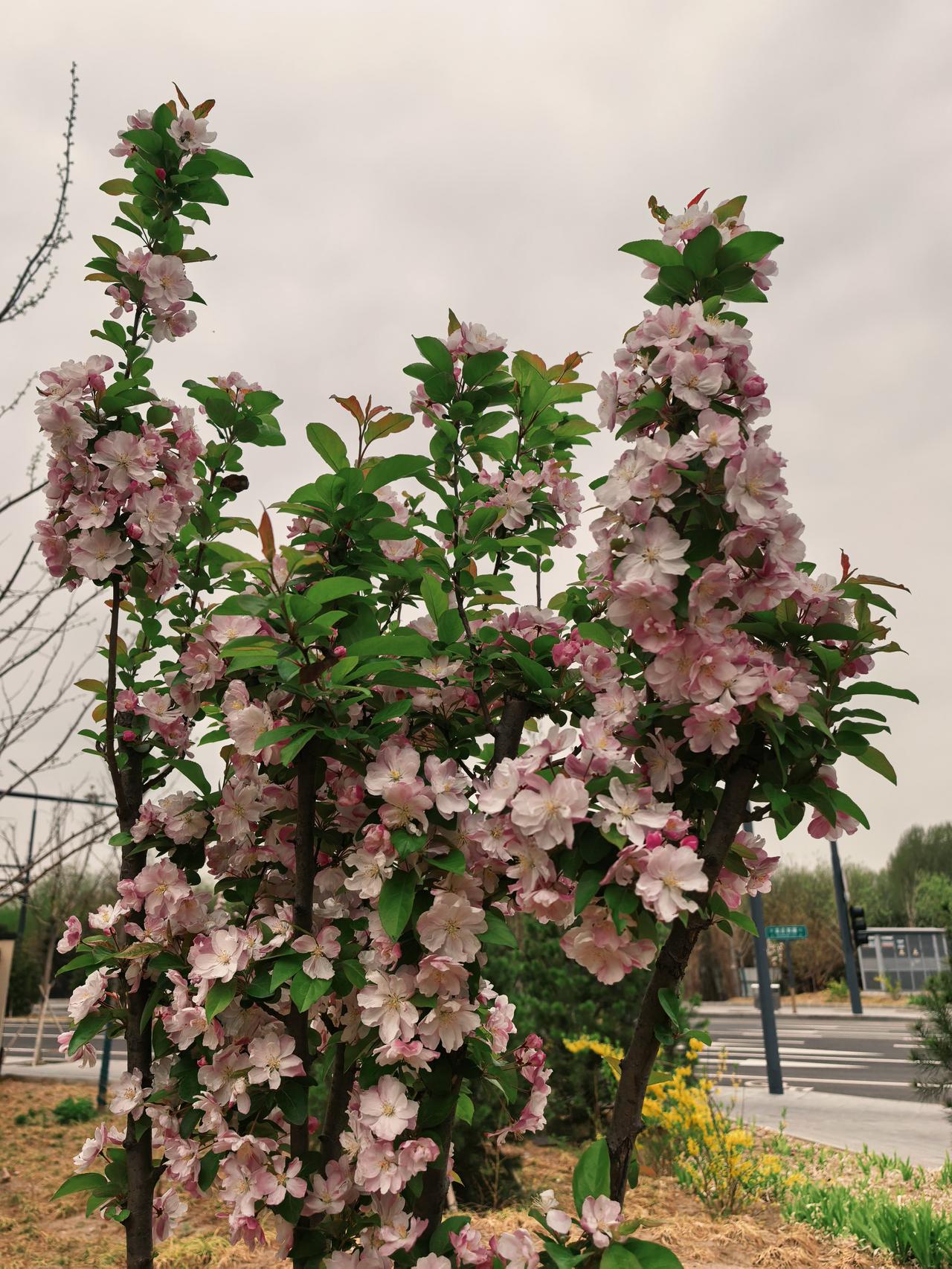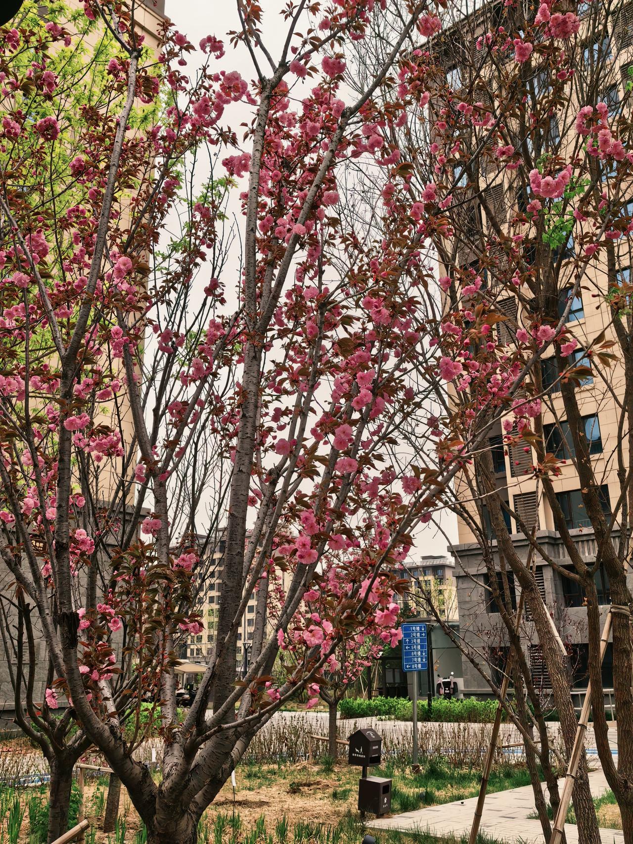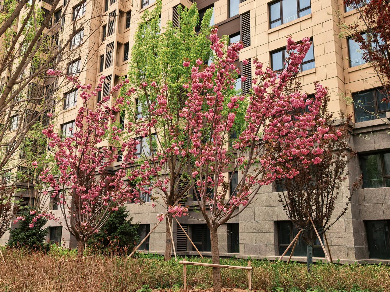 最先绽放的是迎春花,紧接着早樱花登场,随后紫叶李开放,接着桃花、海棠、晚樱、碧桃,相继绽放,将小区装点得美轮美奂。