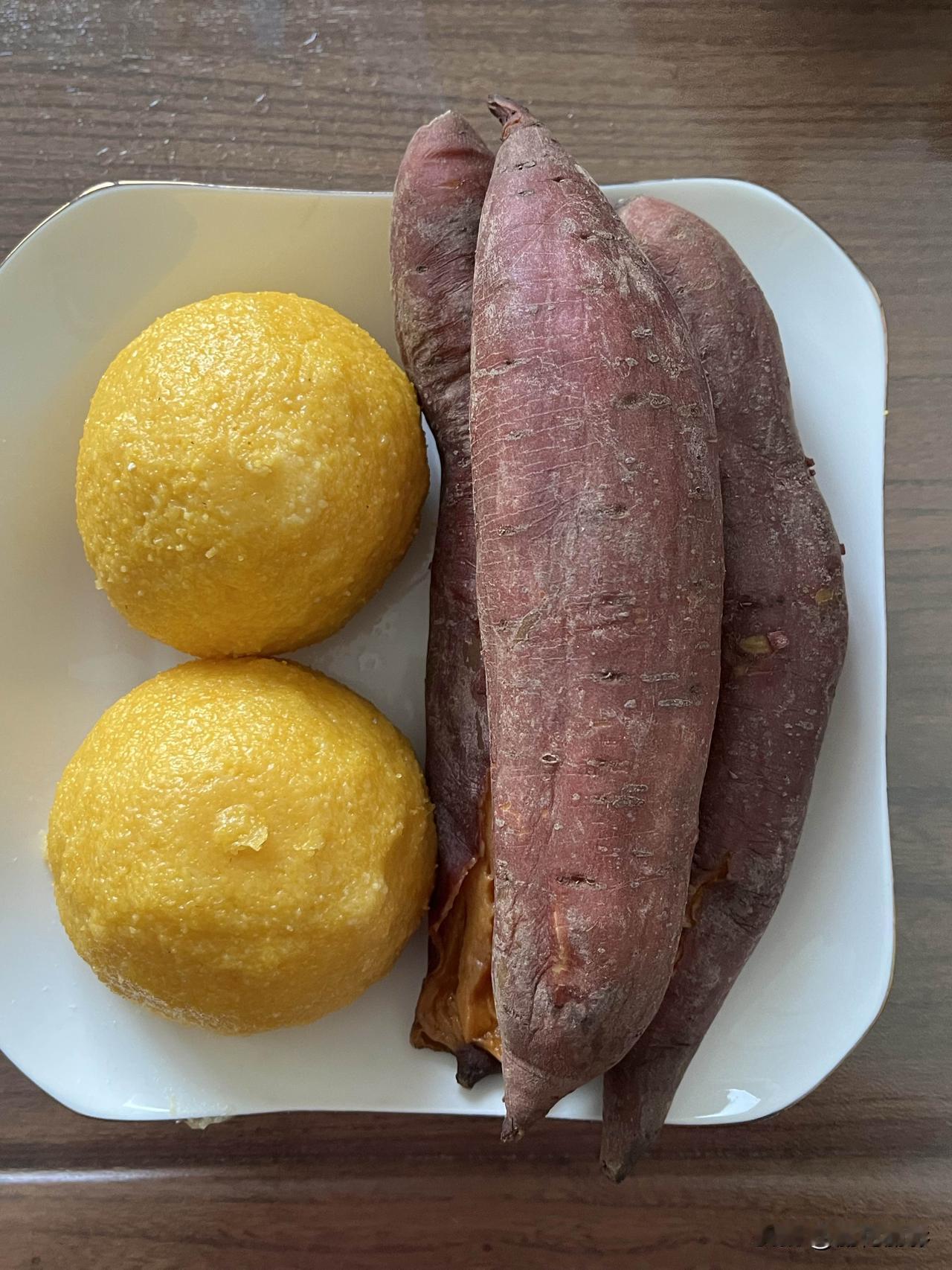 上回蒸的杂粮饭吃完了,今天我蒸了五个小窝头,还有三根红薯,今儿的主食是窝头和红薯。