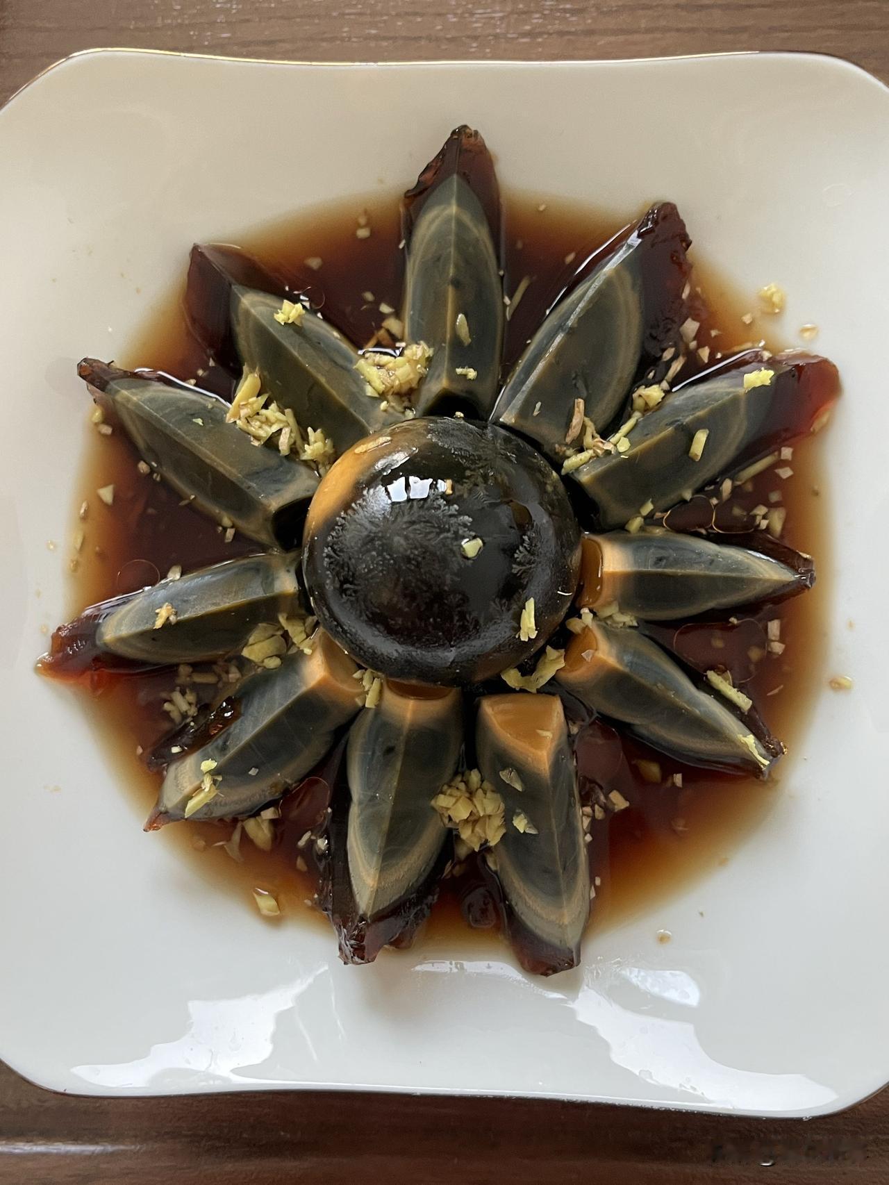 前几天买的青辣椒,今天让先生炒辣椒吃,昨天的羊肉剩了一点儿,我今儿吃炖羊肉。两个菜少了点儿,我又弄了一个松花蛋,这样就够吃了。
