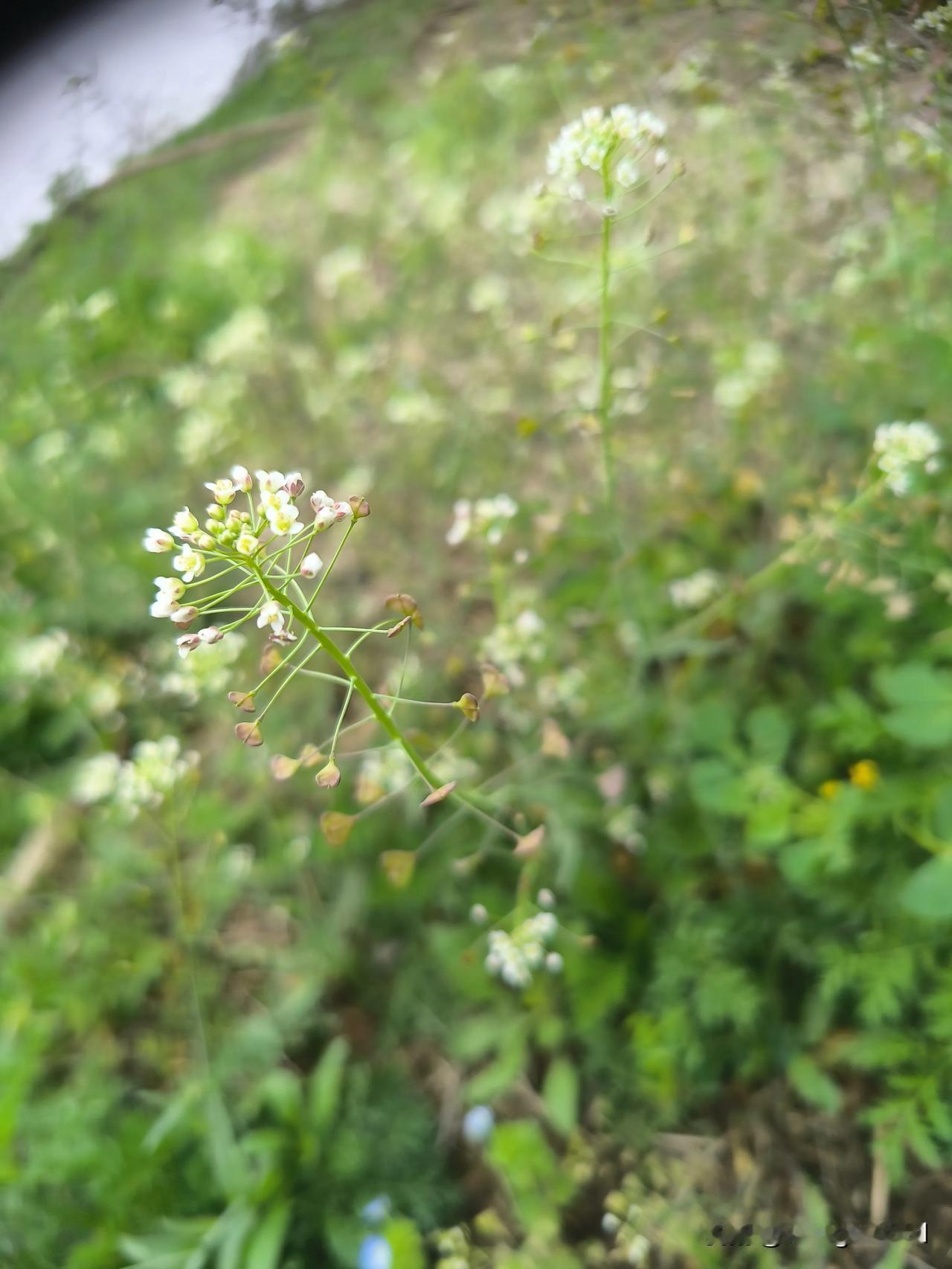那株孤独的油菜花 昨天去郊区钓鱼,在河梯上发现了一株油菜花。在荠菜花的