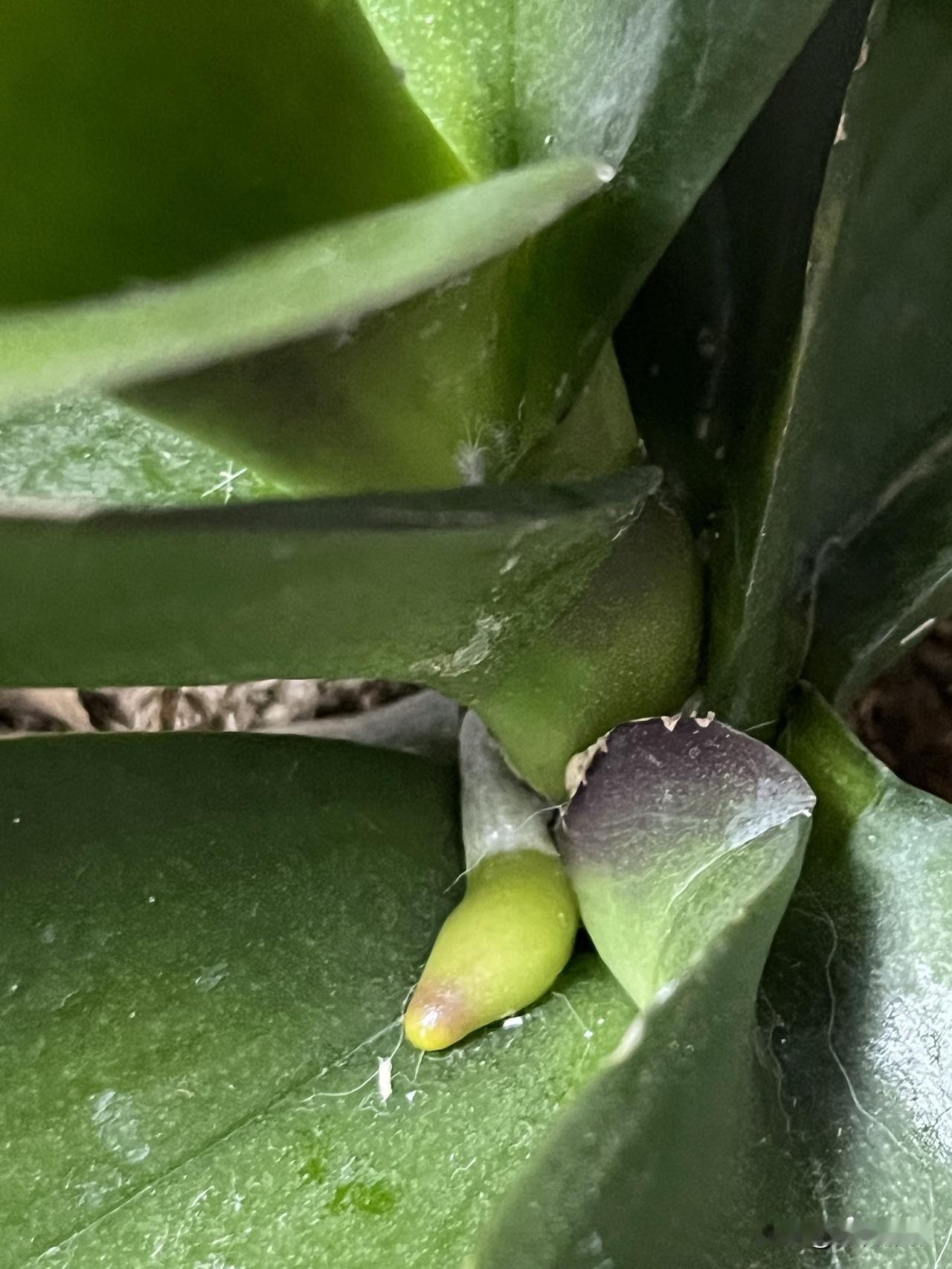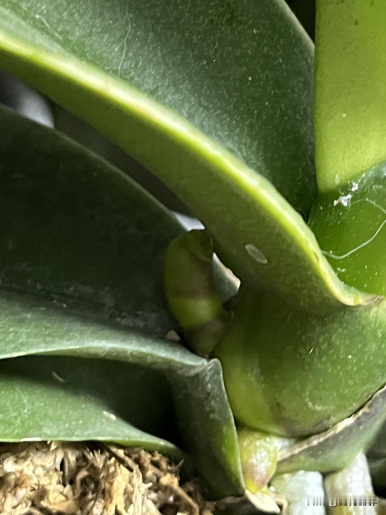 今儿给四盆蝴蝶兰换了水苔,看到有两棵好像是长花箭了。有一棵肯定是花箭,有一棵我还不确定是花箭还是新长的根,再过些日子应该能确定了。