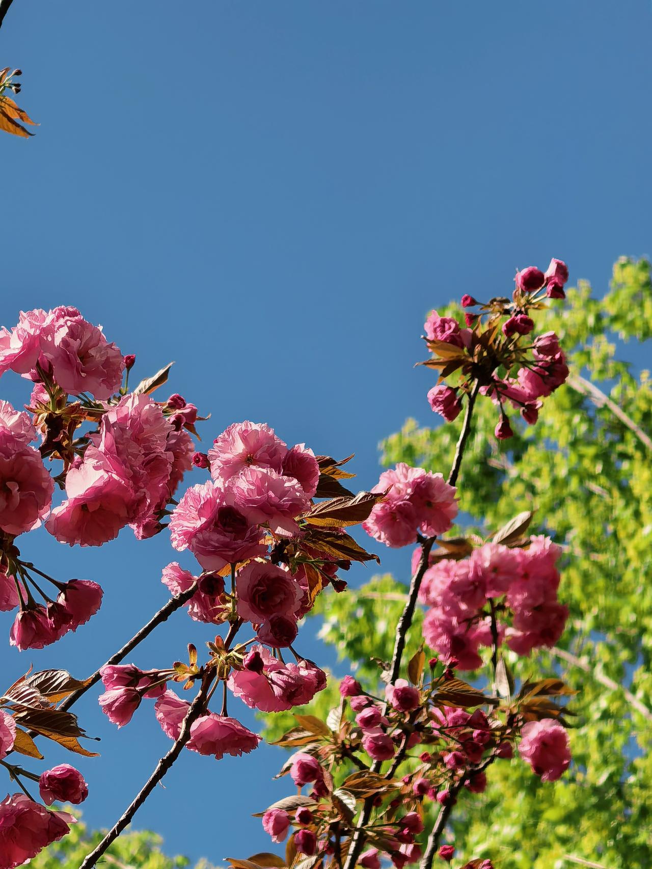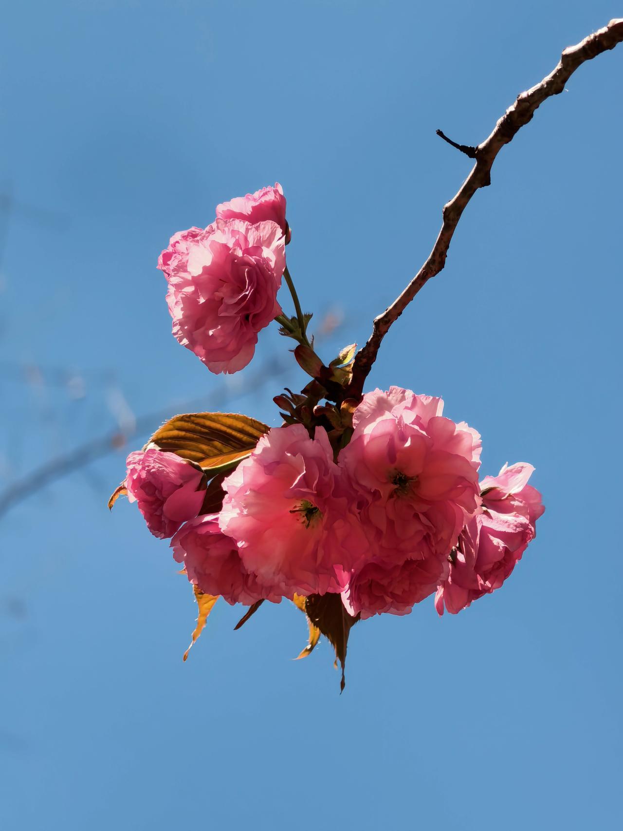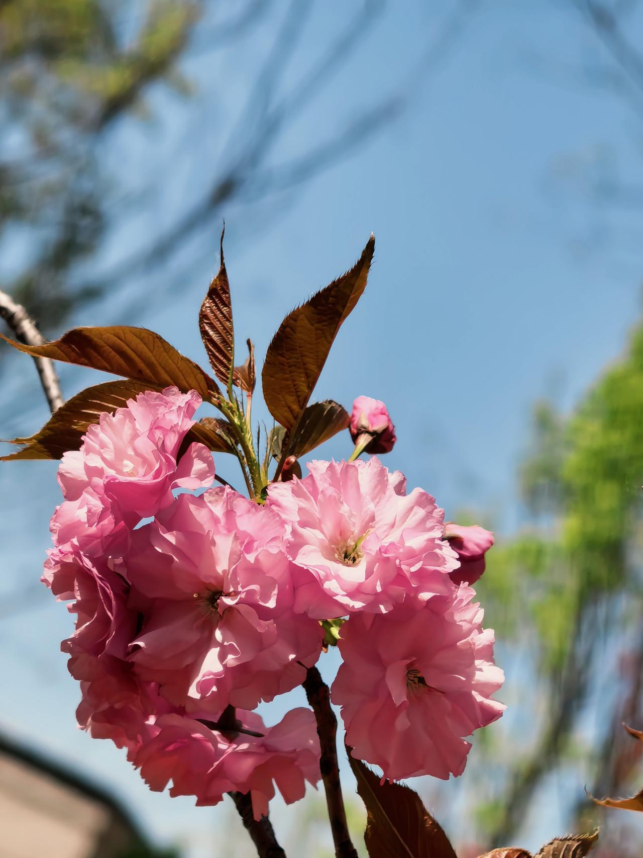 蓝天如洗,鲜花烂漫,桃红柳緑,鸟语花香! 芳菲四月,晚樱绽放,粉红浪漫,随风摇