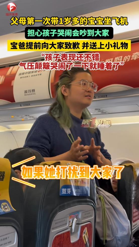(信息来源:《父母第一次带1岁多的宝宝坐飞机,担心孩子哭闹会吵到大家,宝爸提前向大家致歉并送上小礼物,“孩子表现还不错,气压颠簸哭闹了一下就睡着了”。》AHTV第一时间)