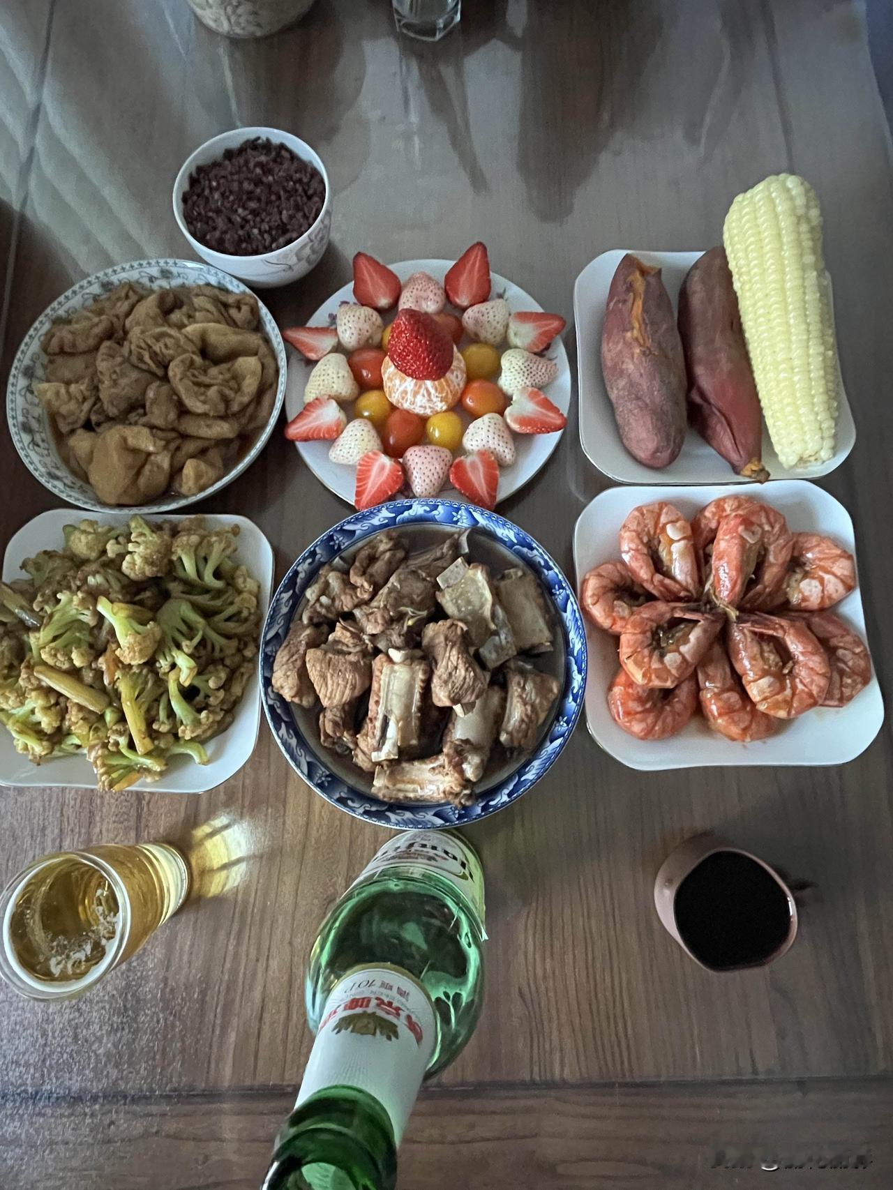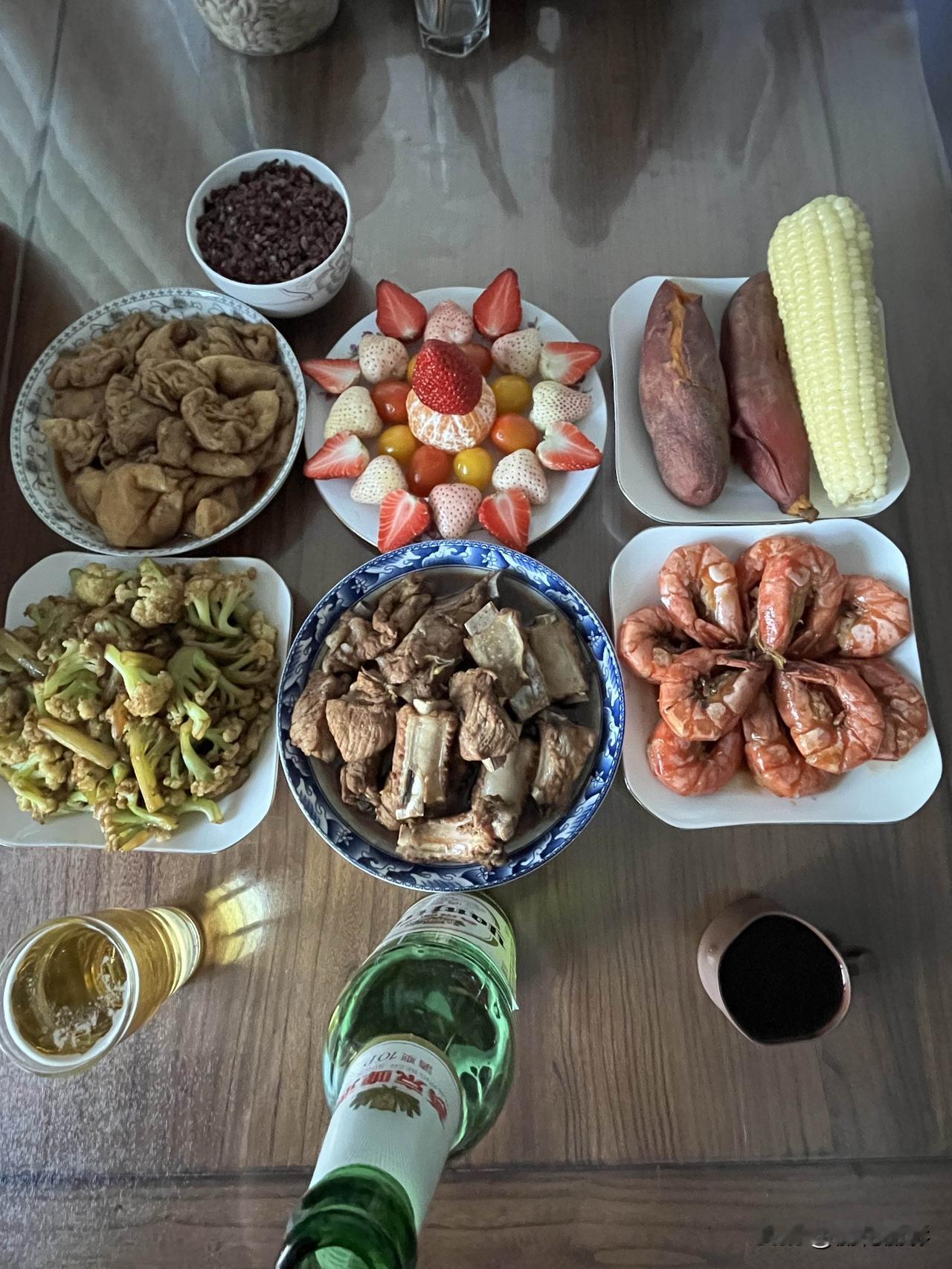 好友们晚上好!周五愉快,晚餐香香!今天的晚餐: 红烧排骨 油焖大虾 素炒菜花 玉