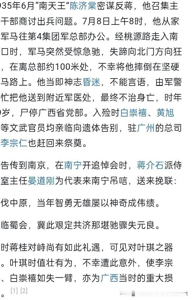 1935年7月,桂系将领叶琪将军在广西南宁坠马身亡,年仅39岁。国民政府褒扬,获蒋介石题“儒将风猷”。