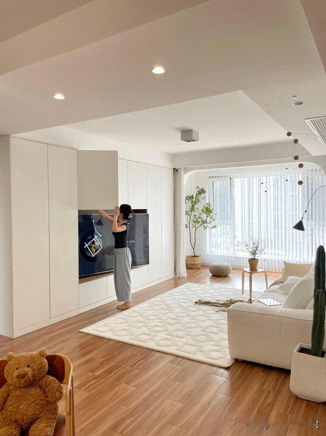 大理石背景墙、木格栅、软包,好看但没用。不如整面墙做储物柜,电视嵌进去。零食、玩具、药箱、工具箱……全藏起来。柜门一关,客厅空无一物,显大又清爽。底部悬空20厘米,扫地机器人自由进出。📺