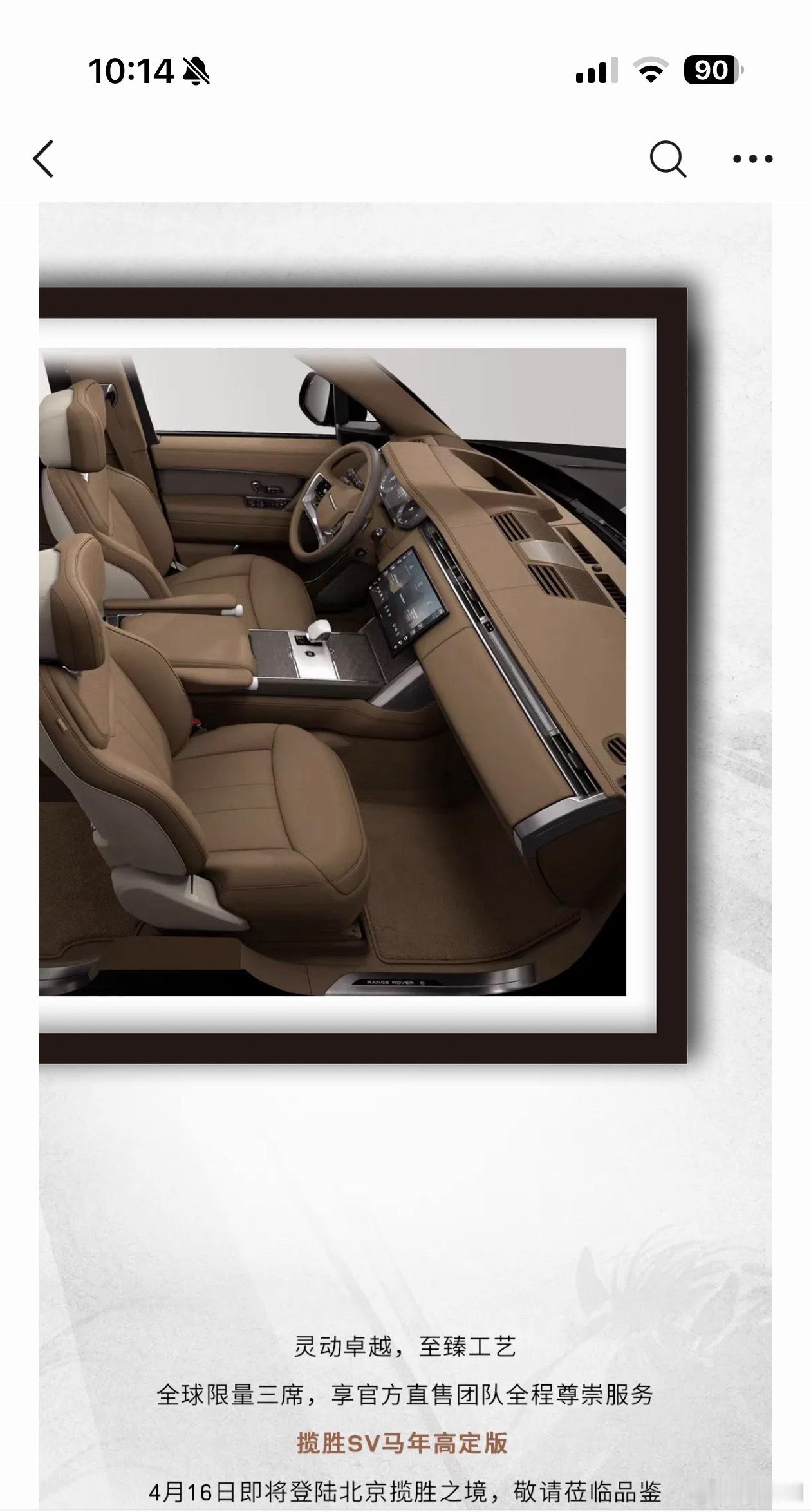 给关注限量版揽胜的粉丝发一下,揽胜SV马年高定版明天即将发布,目前官微公布了一些局部图,内饰各处细节都比普通揽胜SV有不同。全球限量3台,据悉目前还有2台。大v聊车