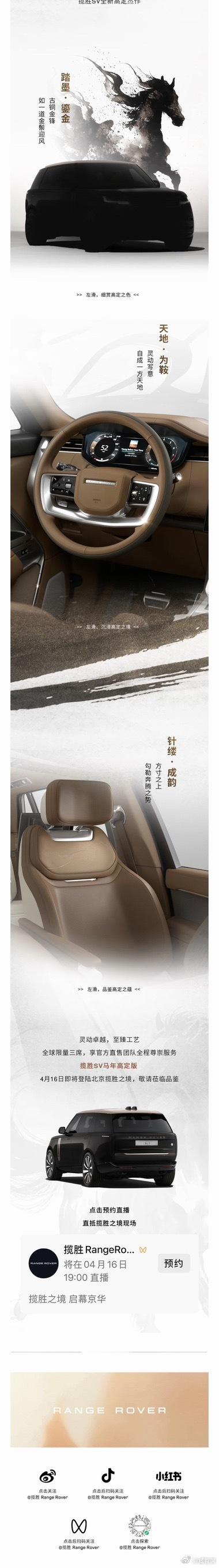 给关注限量版揽胜的粉丝发一下,揽胜SV马年高定版明天即将发布,目前官微公布了一些
