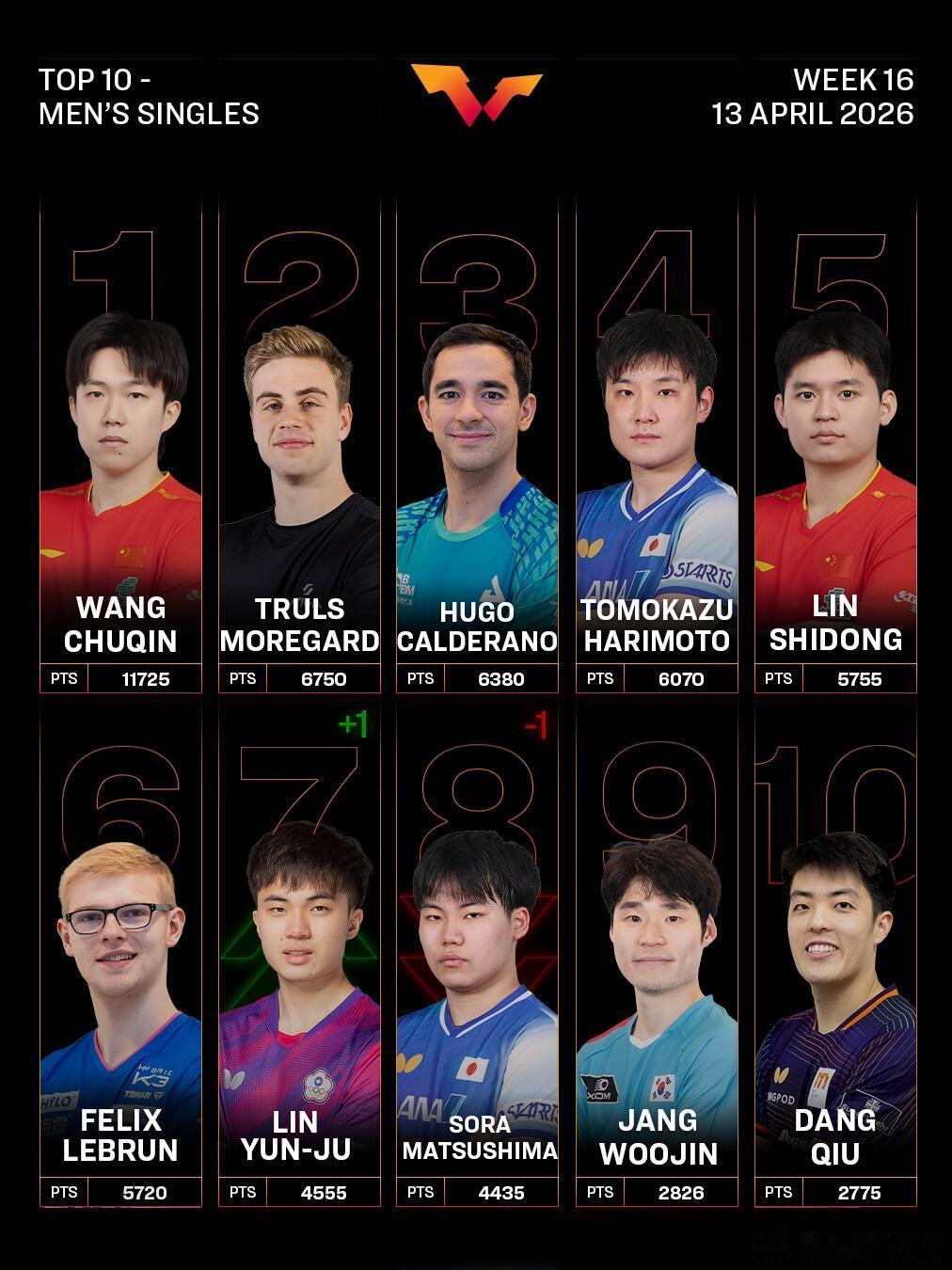 王楚钦依旧稳居世界第一,林昀儒世排重饭世界第七。