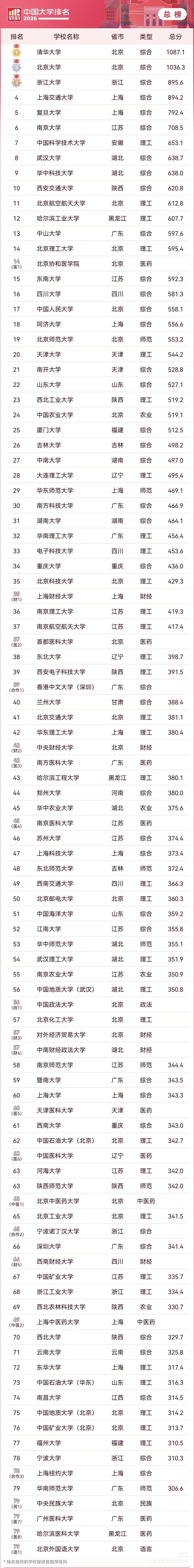 2026年4月15日,软科发布“2026中国大学排名”。这个榜单采用分类评价,把高校分成综合性、单科性和非公办大学来排名。