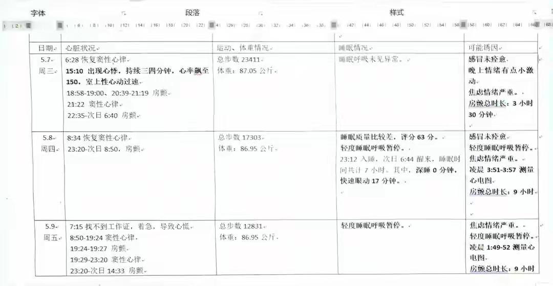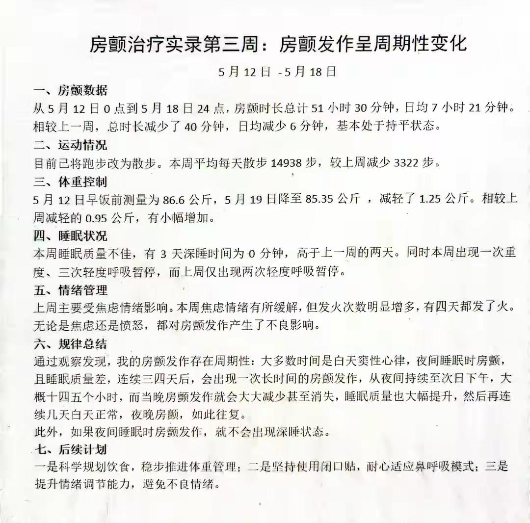 我每天记录房颤发作、心率、运动、体重、睡眠、呼吸、情绪,每周复盘迭代。