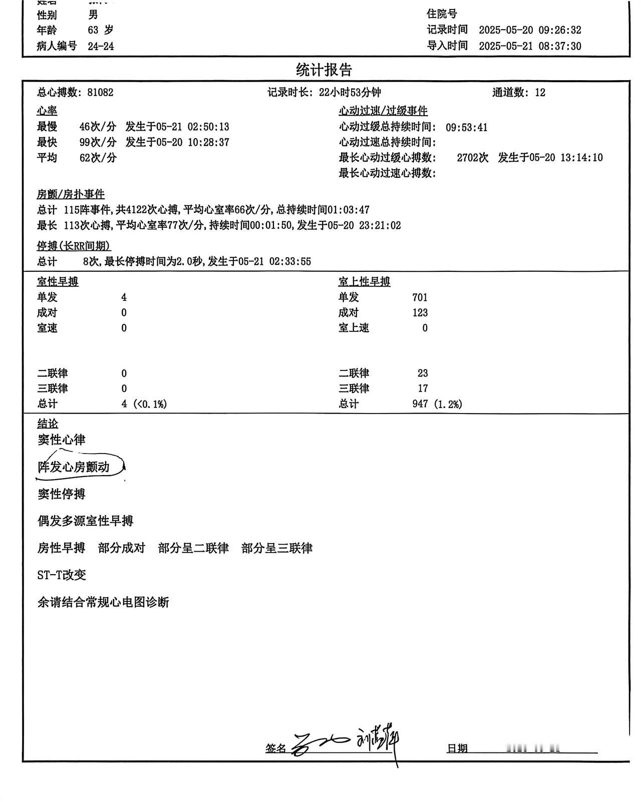 经过一年多的修养调理,现在他房颤负荷从5%降到4.6%。但同时,最长心脏停搏达到2秒,出现窦性停搏;房性早搏数量增多;同时伴有ST-T改变,提示心肌供血需要重点关注。