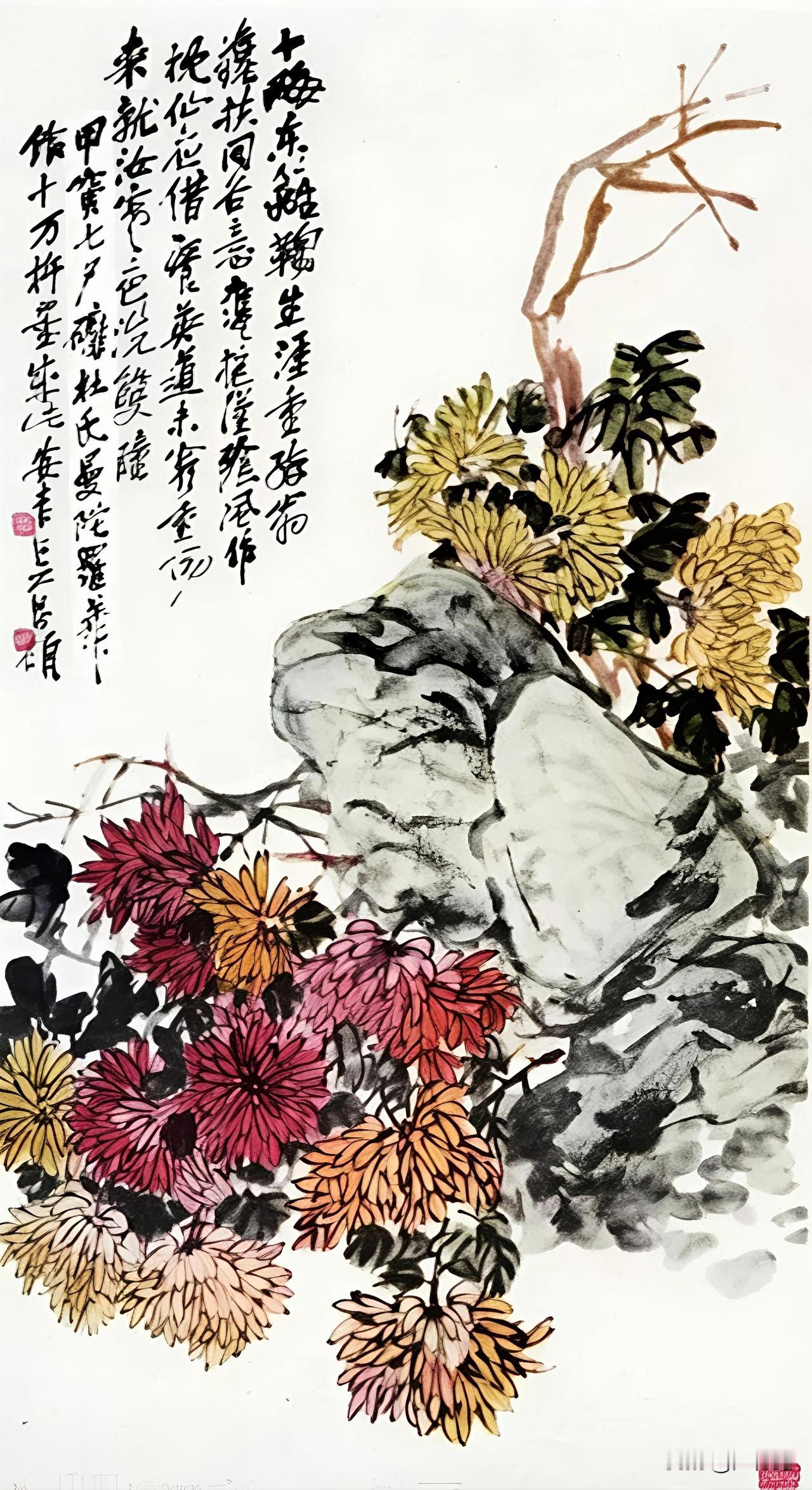 这幅画以苍劲的篆籀笔法绘出巨石,再以浓艳的红黄秋菊点缀其间,既体现了金石书画的厚重感,又借傲霜的菊花象征高洁品格,是吴昌硕晚年写意花卉的典型代表作。
