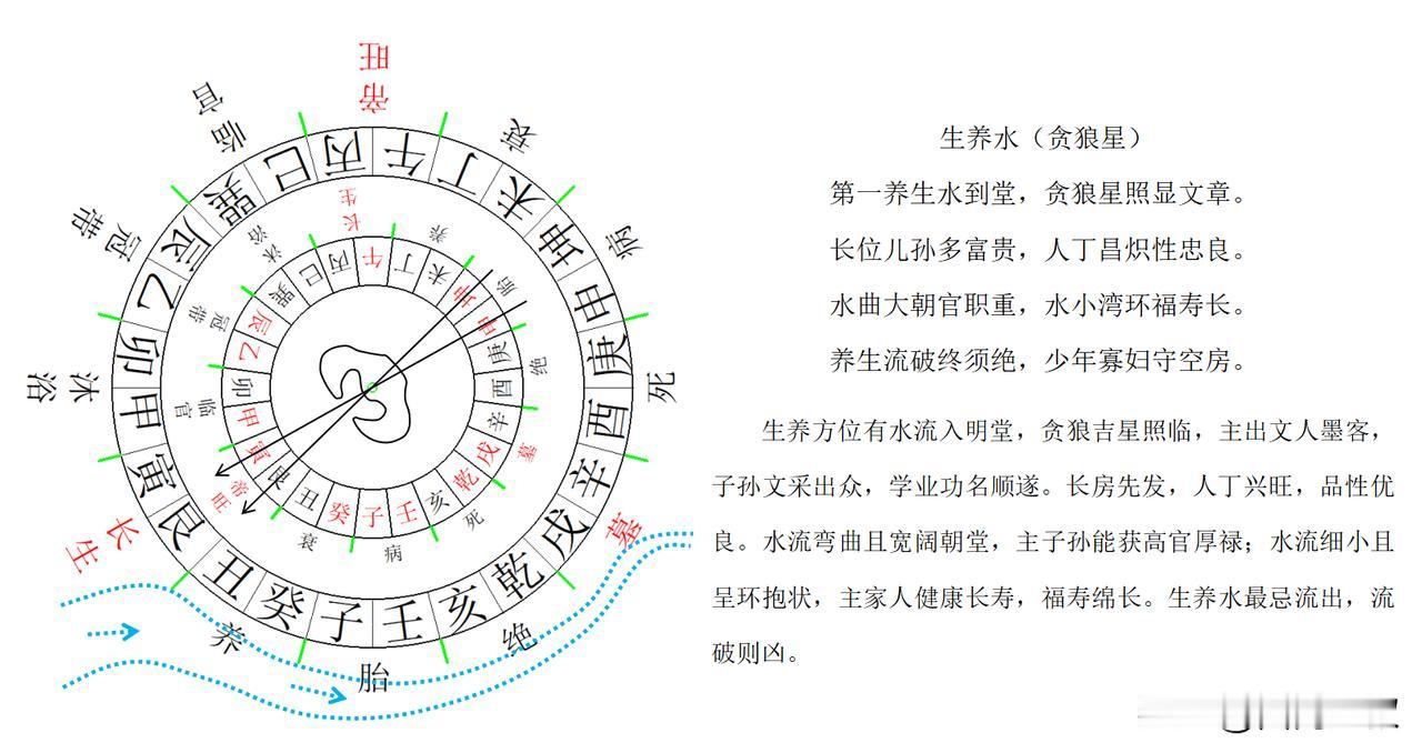 “第一养生水到堂,贪狼星照显文章。长位儿孙多富贵,人丁昌炽性忠良。水曲大朝官职重,水小湾环福寿长。养生流破终须绝,少年寡妇守空房。”