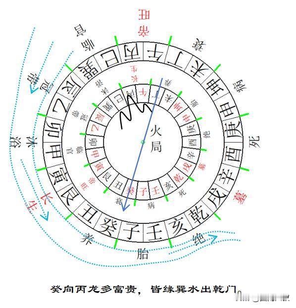 “癸向丙龙多富贵,皆缘巽水出乾门。”——丙方来龙入首(生龙),立癸向水出乾方(养向绝流),多富贵。