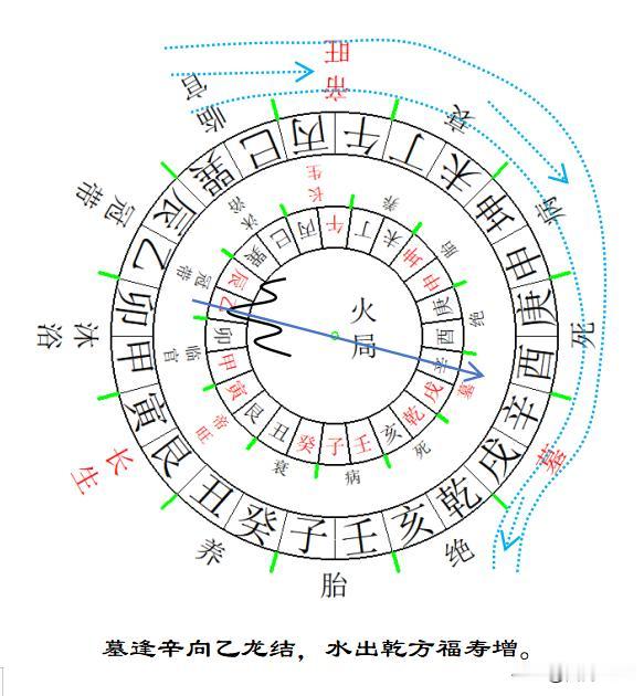“墓逢辛向乙龙结,水出乾方福寿增。”——乙方来龙入首(冠带龙),立辛向水出乾方(墓向绝流),多福增寿。