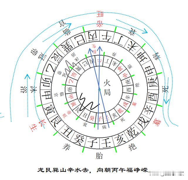 “龙艮巽山辛水去,向朝丙午福峥嵘。”——艮方来龙入首,巽方有秀丽山峰,水归墓库从辛山流,立丙午向(正旺向)。此格局旺龙入首,立正旺向,所以说“福峥嵘”(富贵显赫)。