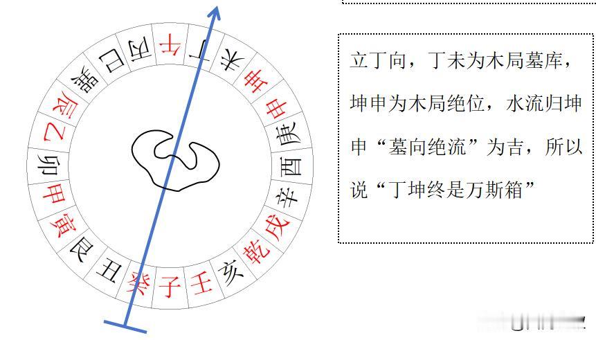 立丁向,丁未为木局墓库,坤申为木局绝位,水流归坤申“墓向绝流”为吉,所以说“丁坤终是万斯箱”。