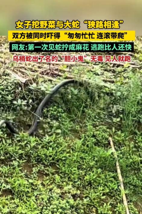 近日四川,女子挖野菜与乌梢蛇狭路相逢,双方被同时吓得连滚带爬。网友戏称,第一次见