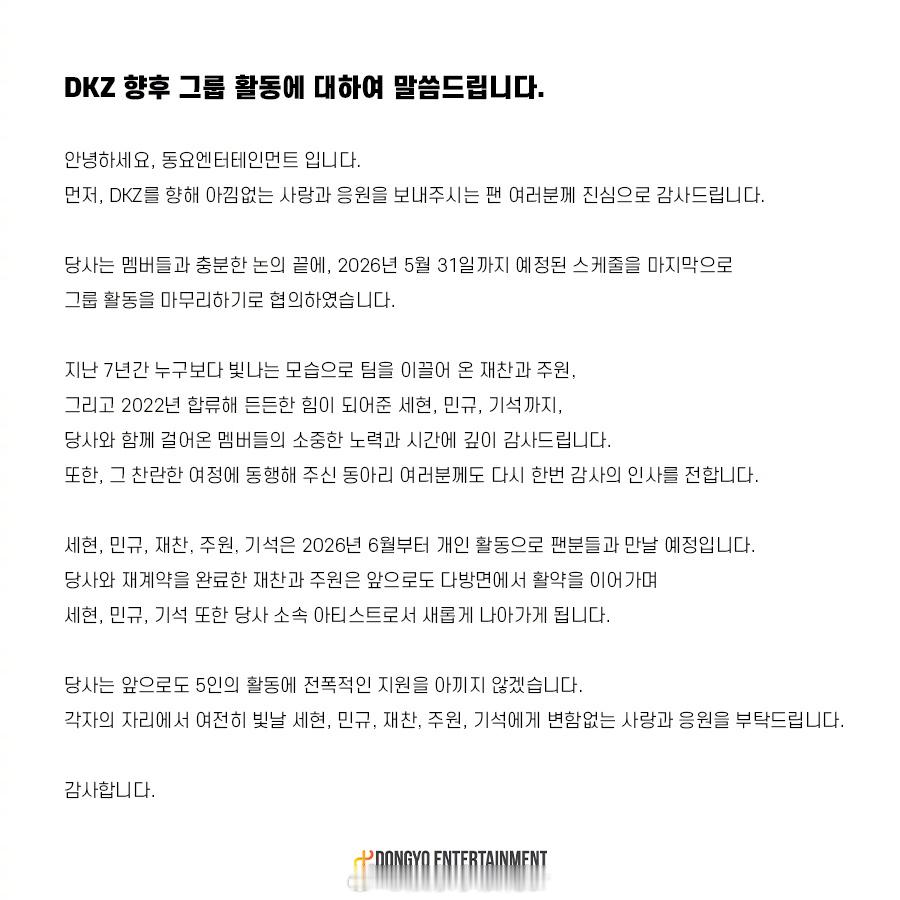 DKZ活动终止朴宰燦组合活动终止 朴宰燦组合DKZ宣布将解散,活动终止:“本公司在与成员们进行充分讨论後,一致同意将2026年5月31日之前预定的行程作为最後,并结束团体活动。”