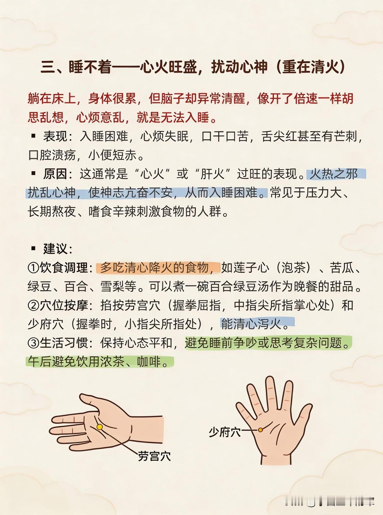 ✅睡不着→心火旺盛,重在清火