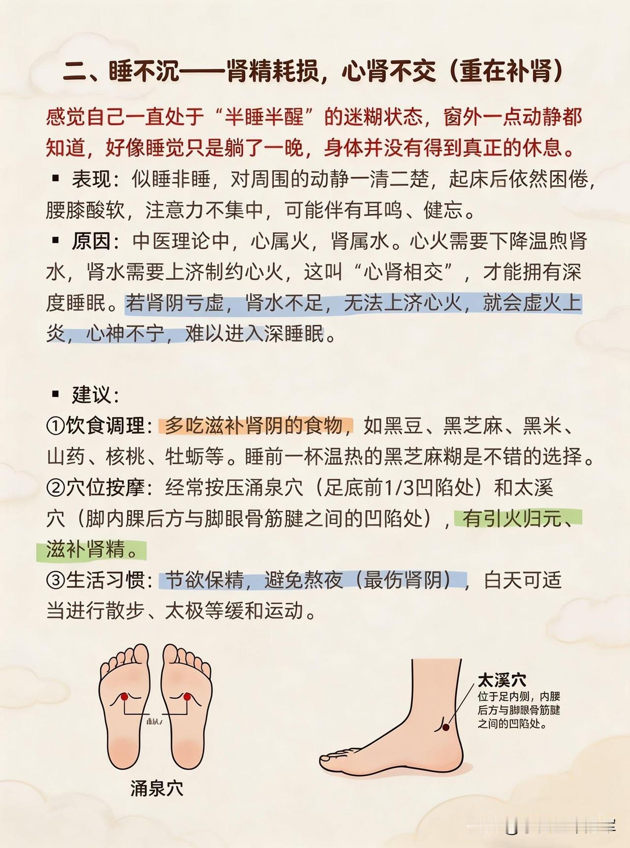 ✅睡不沉→肾精耗损,重在补肾