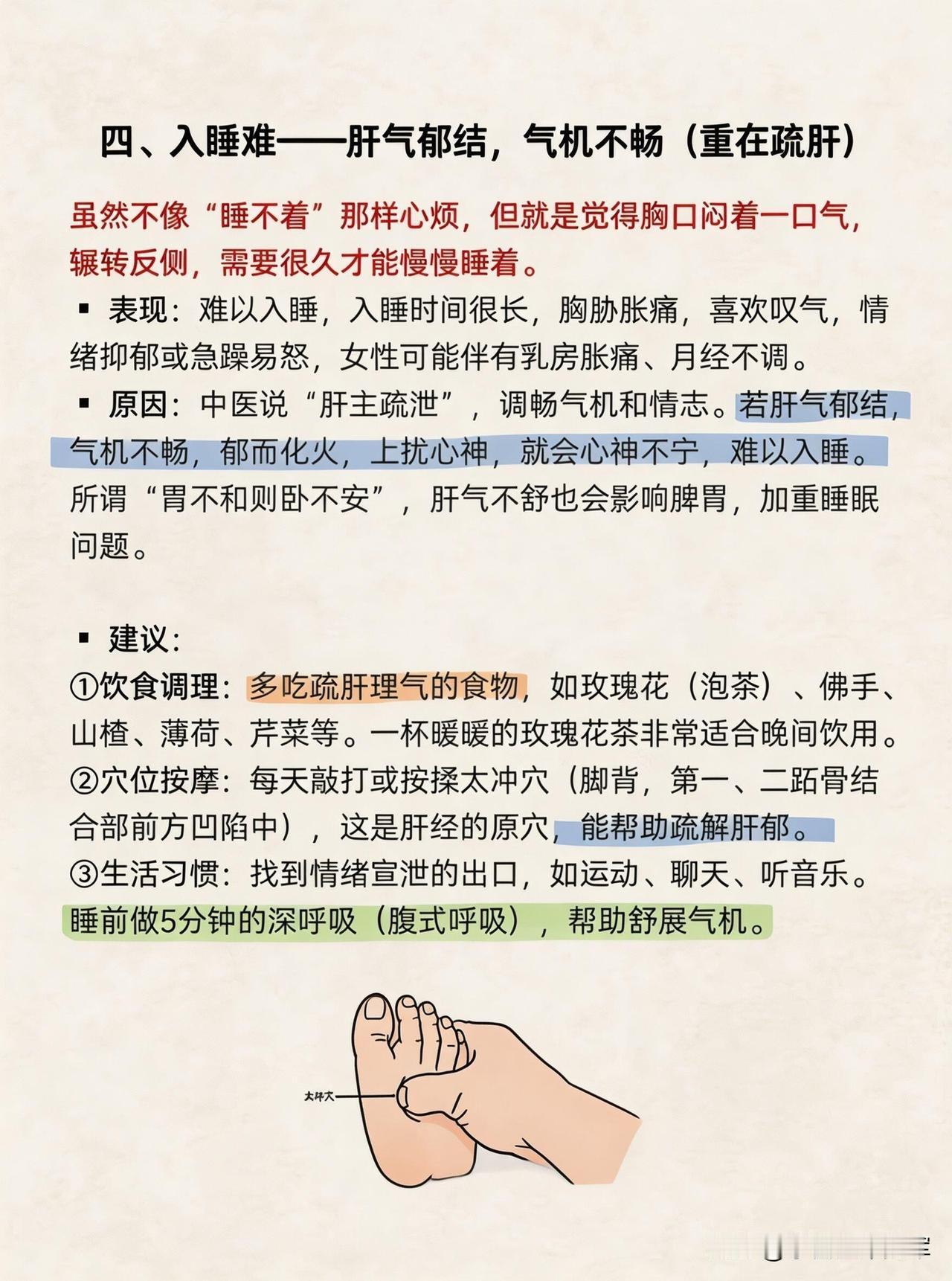 ✅入睡难→肝气郁结,重在疏肝