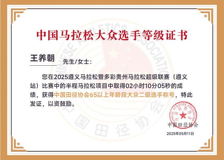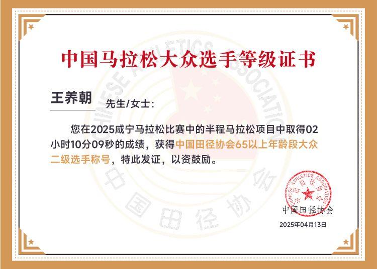 2025年11月23号,防城港中国--东盟马拉松半马成绩2:06:14。按照今年标准达到了65岁以上级别大众一级。去年只能达到大众二级标准。