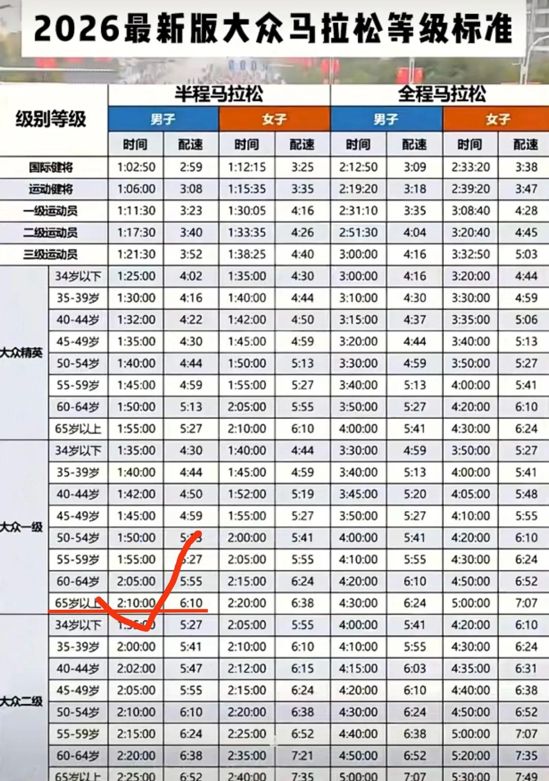 2025年半马65岁以上大众一级标准是2:05:00。2026年修改为2:10:00。