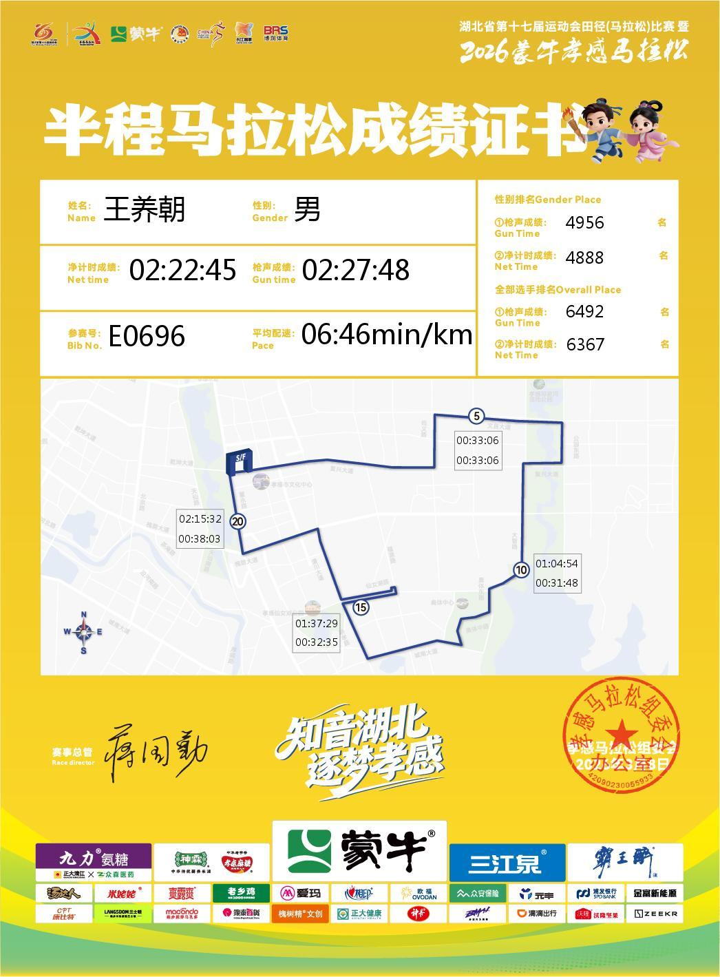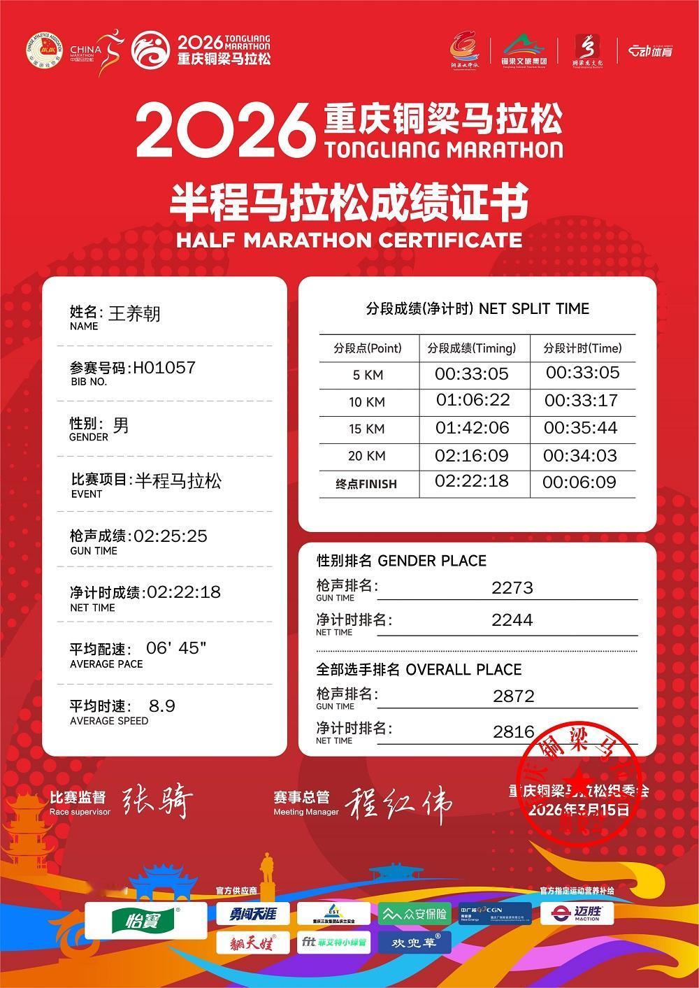 半马一般是15到18公里撞墙期,15公里后小民放慢速度,增加补给,必须保证安全完赛。最后6.0975公里走走跑跑用了45分48秒。算是2026年五场半马最好成绩。但比自己参加马拉松比赛最好成绩2:04:19差远了。