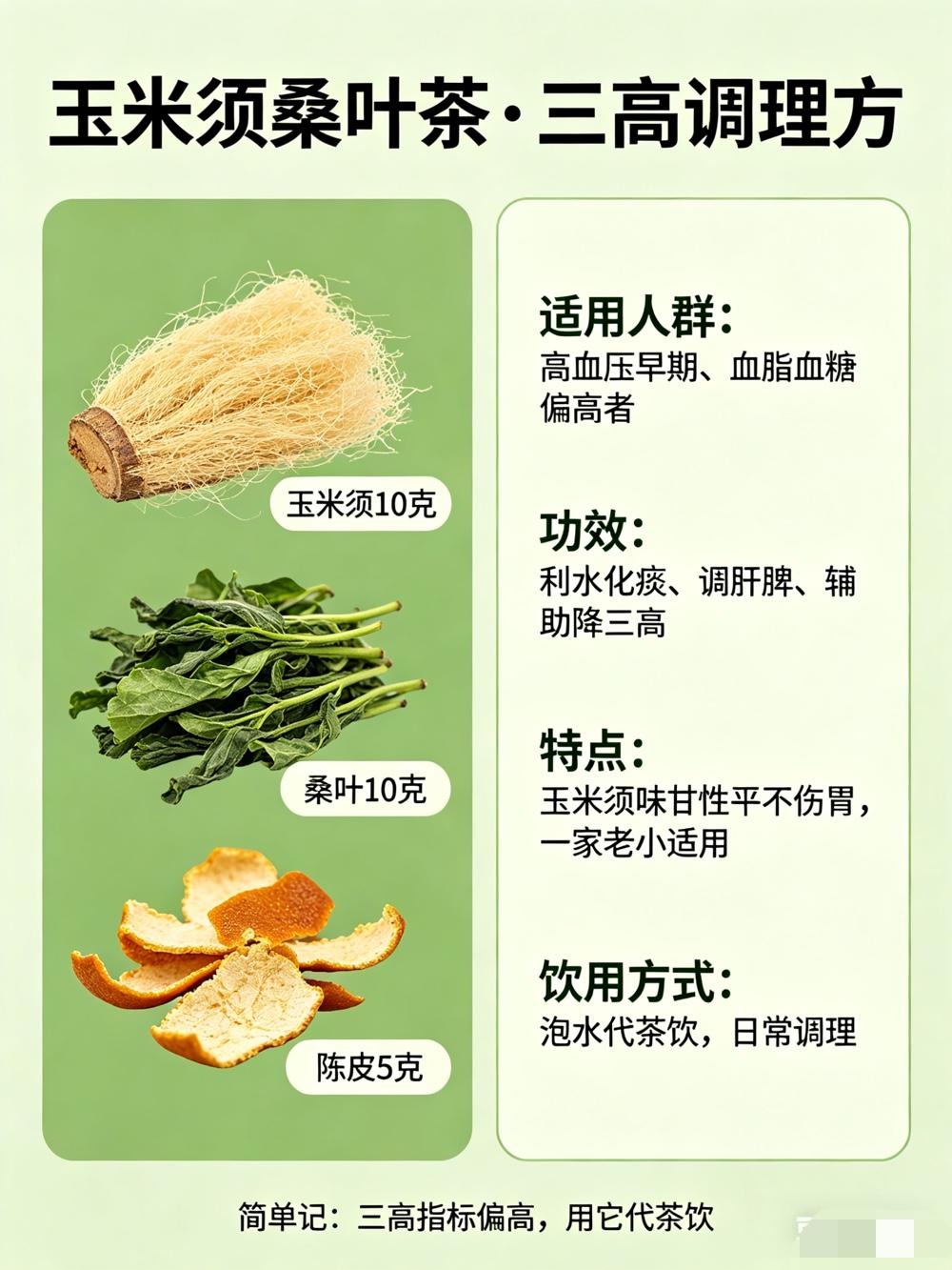 玉米须10克、桑叶10克、陈皮5克,泡水代茶饮。利水化痰、调肝脾、辅助降三高,适合高血压早期、血脂血糖偏高的人长期饮用。玉米须味甘性平,不伤胃,一家老小都能喝。