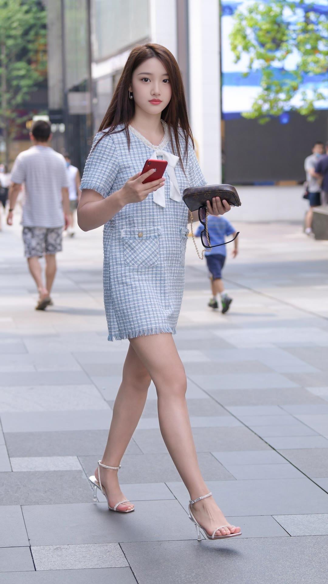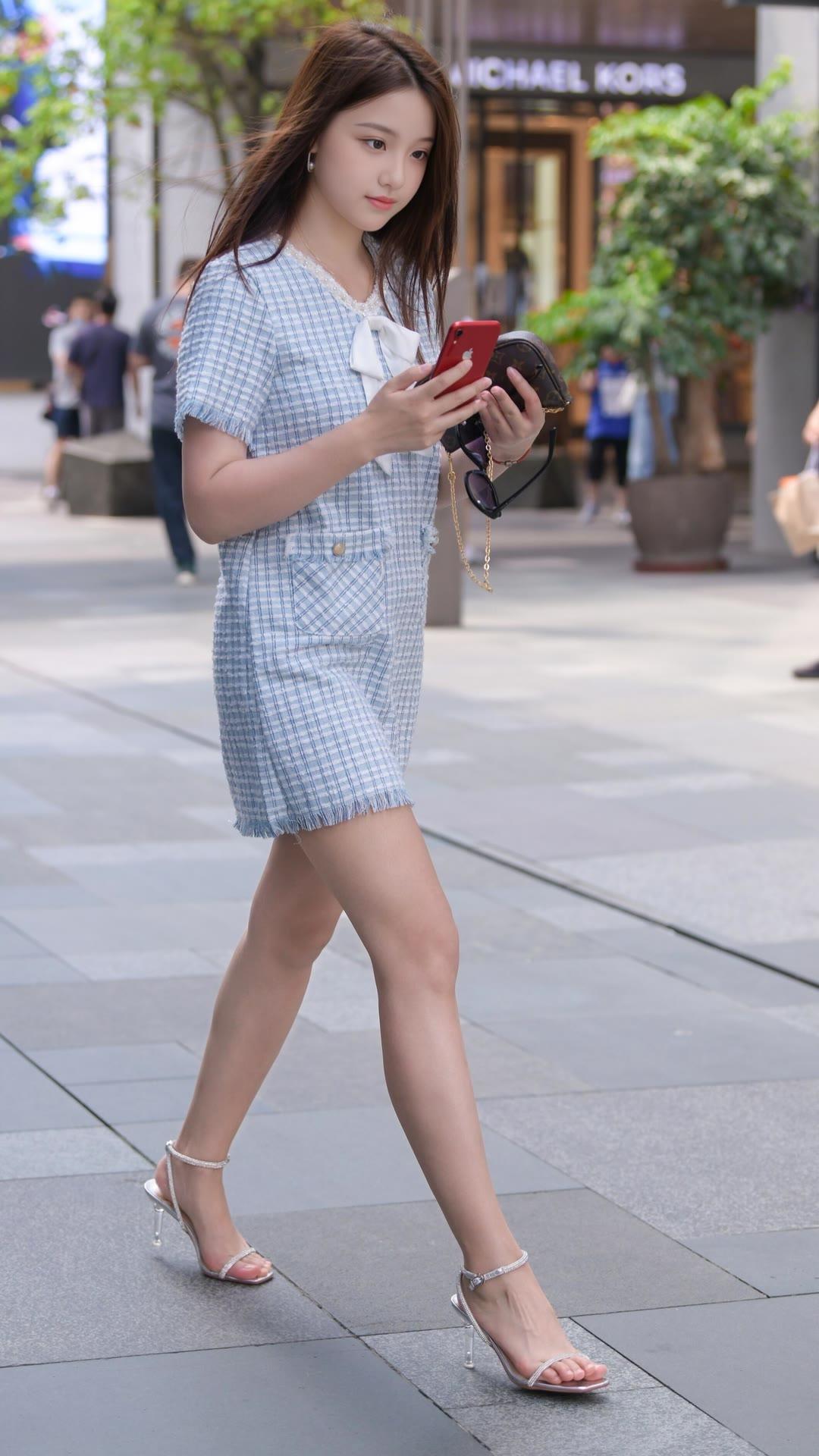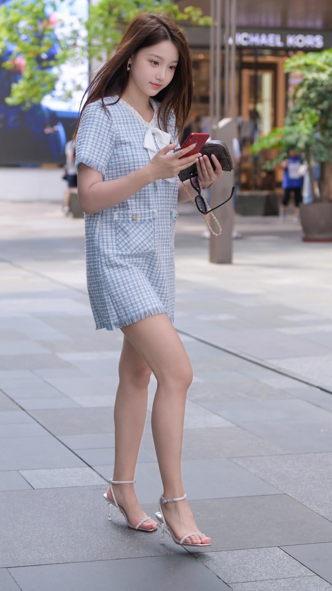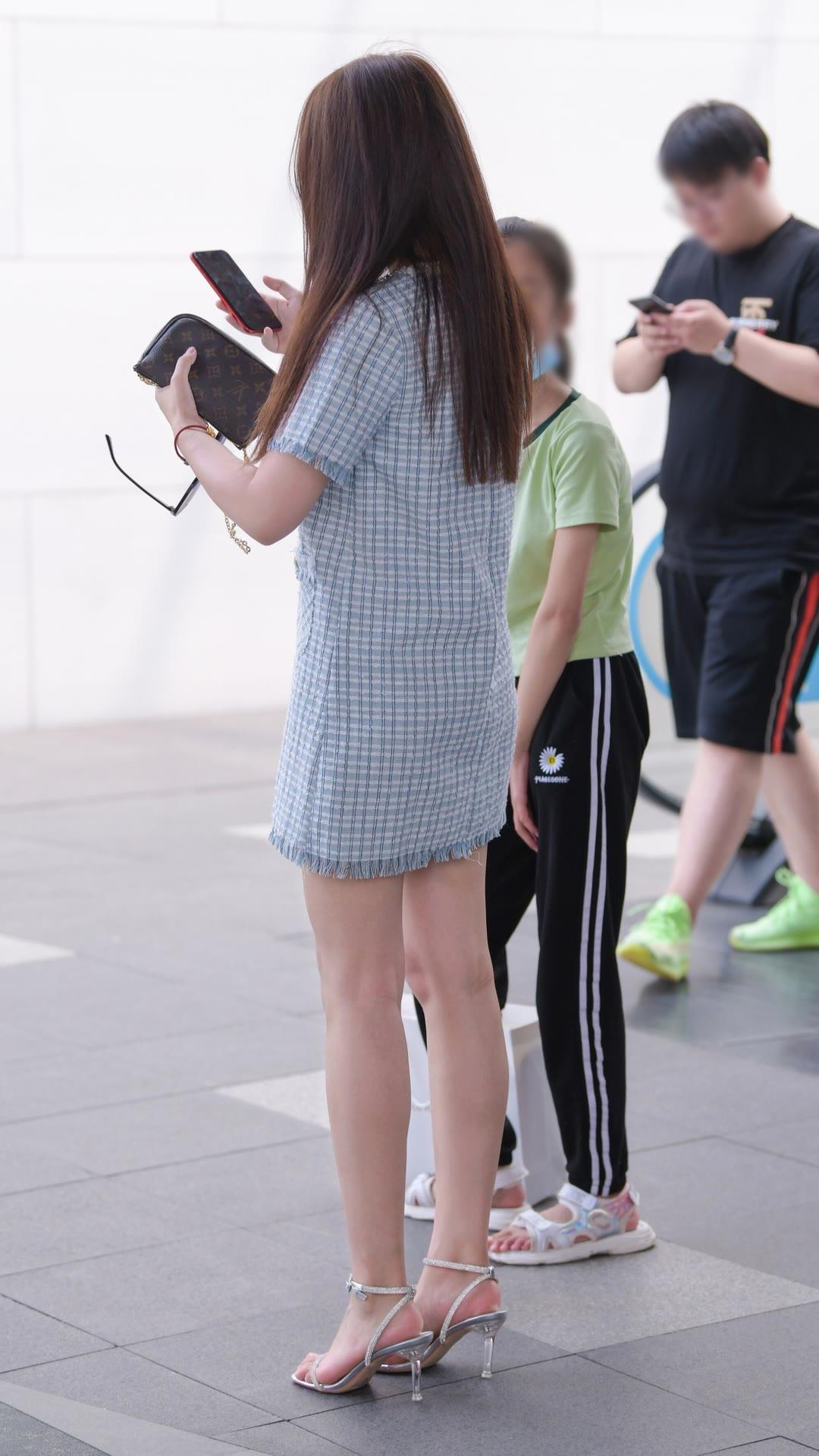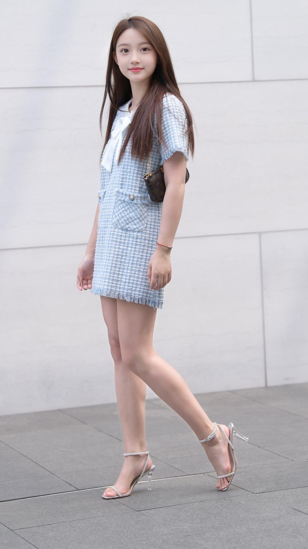 一件浅蓝格纹短款连衣裙搭配了一双银色细高跟凉鞋,给人一种清新、自然的感觉。