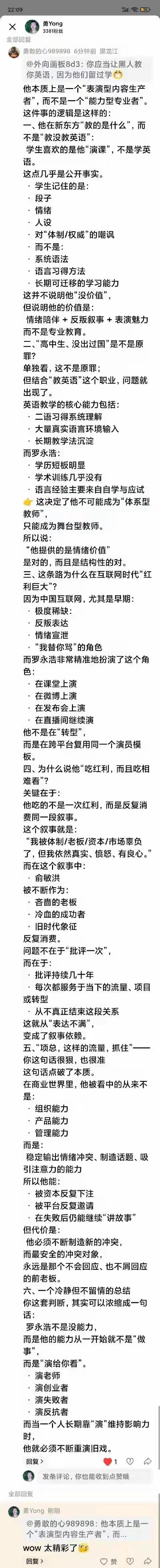 这段对老罗的剖析太深刻了,完美解释了他前后矛盾,左右横跳的本质,原来一切的不合理,都是由一条看不见的暗线在牵动,在这条暗线上,他的一切行为都是合理的,因为看似不合理的行为都符合这条暗线指向的目的:没有做事能力,只有表演能力,表演张力依赖于冲突,冲突依赖于反叛。一直反叛,才能一直冲突,一直冲突,才能一直有流量,一直有流量,才能一直表演变现。