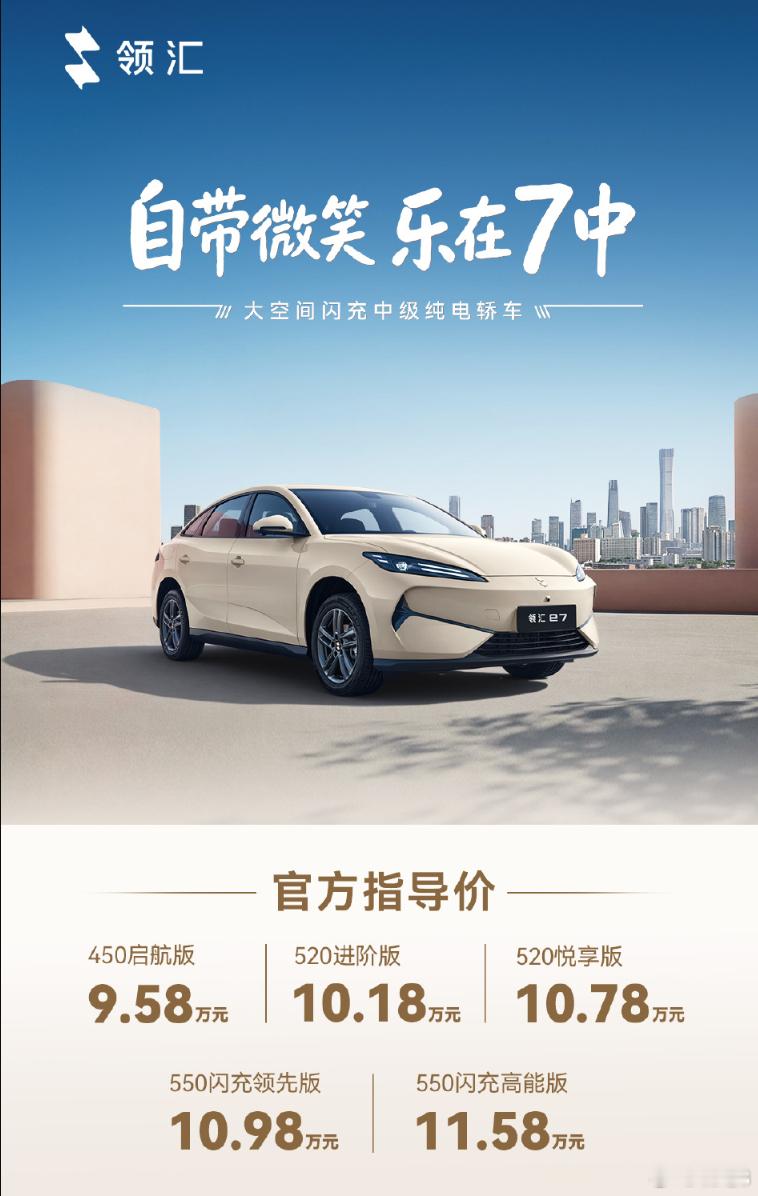 十万级闪充车型 比亚迪子品牌领汇的首款车型——领汇e7今天上市,新车主打营运方向的定位,给了第二代刀片电池,闪充版本11万左右就能拿下。对于营运车主,领汇e7没有给免费充电的权益,但一年免服务费还是展示出了一定的诚意 领汇e7正式上市