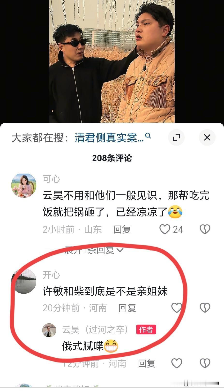 昨天某人直播中竟说云昊承认了此事,一遍遍地重复说,云昊在评论区承认了柴桑与许妈不是亲姐妹关系。瞪大你们的眼睛看清楚了——评论区🈶网友问:许妈和柴到底是不是亲姐妹?云昊回:俄式腻喋。
